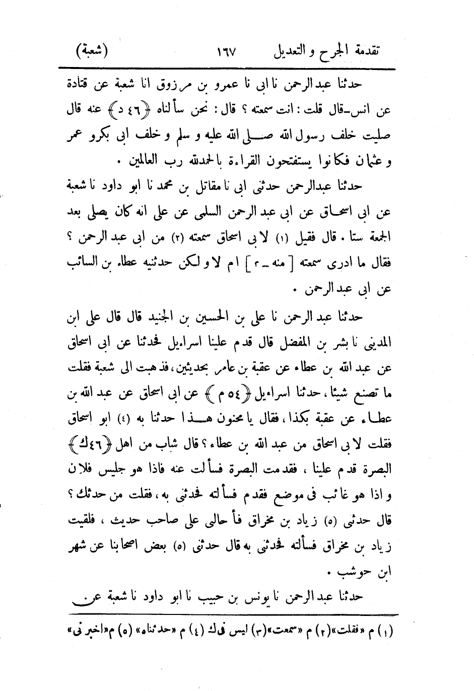 حَدثنا عَبد الرَّحمن، حَدثنا علي بن الحسين بن الجنيد قال: قال علي بن المَديني، حَدثنا بشر بن المفضل قال قدم علينا إِسرائيل فحَدثنا، عَن أَبي إِسحاق، عَن عَبد الله بن عطاء عن عقبة بن عامر بحديثين، فذهبت إلى شُعبة فقلتُ: ما تصنع شيئًا، حَدثنا إِسرائيل، عَن أَبي إِسحاق، عَن عَبد الله بن عطاء عن عقبة بكذا، فقال يا مجنون هذا حَدثنا به أَبو إِسحاق فقلت لأَبي إِسحاق من عَبد الله بن عطاء؟ قال شاب من أهل البصرة قدم علينا، فقدمت البصرة فسألت عنه فإذا هو جليس فلان وإذا هو غائب في موضع فقدم فسألته فحدثني به، فقلت من حدثك؟، قال: حَدثني زياد بن مخراق فأحالني على صاحب حديث، فلقيت زياد بن مخراق فسألته فحدثني به، قال: حَدثني بعض أَصحابنا عن شهر بن حوشب.