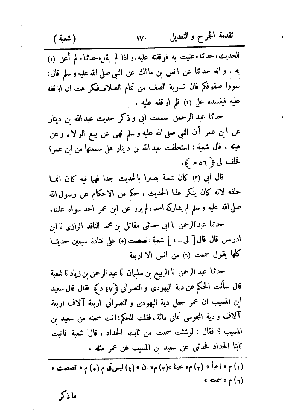 حَدثنا عَبد الرَّحمن، حَدثنا أبي حدثني مقاتل بن محمد الناقد الرازي، حَدثنا ابن إدريس قال: قال لي شُعبة: نصصت على قتادة سبعين حديثا كلها يقول: سَمِعتُ من أَنس إِلاَّ أَربعة.