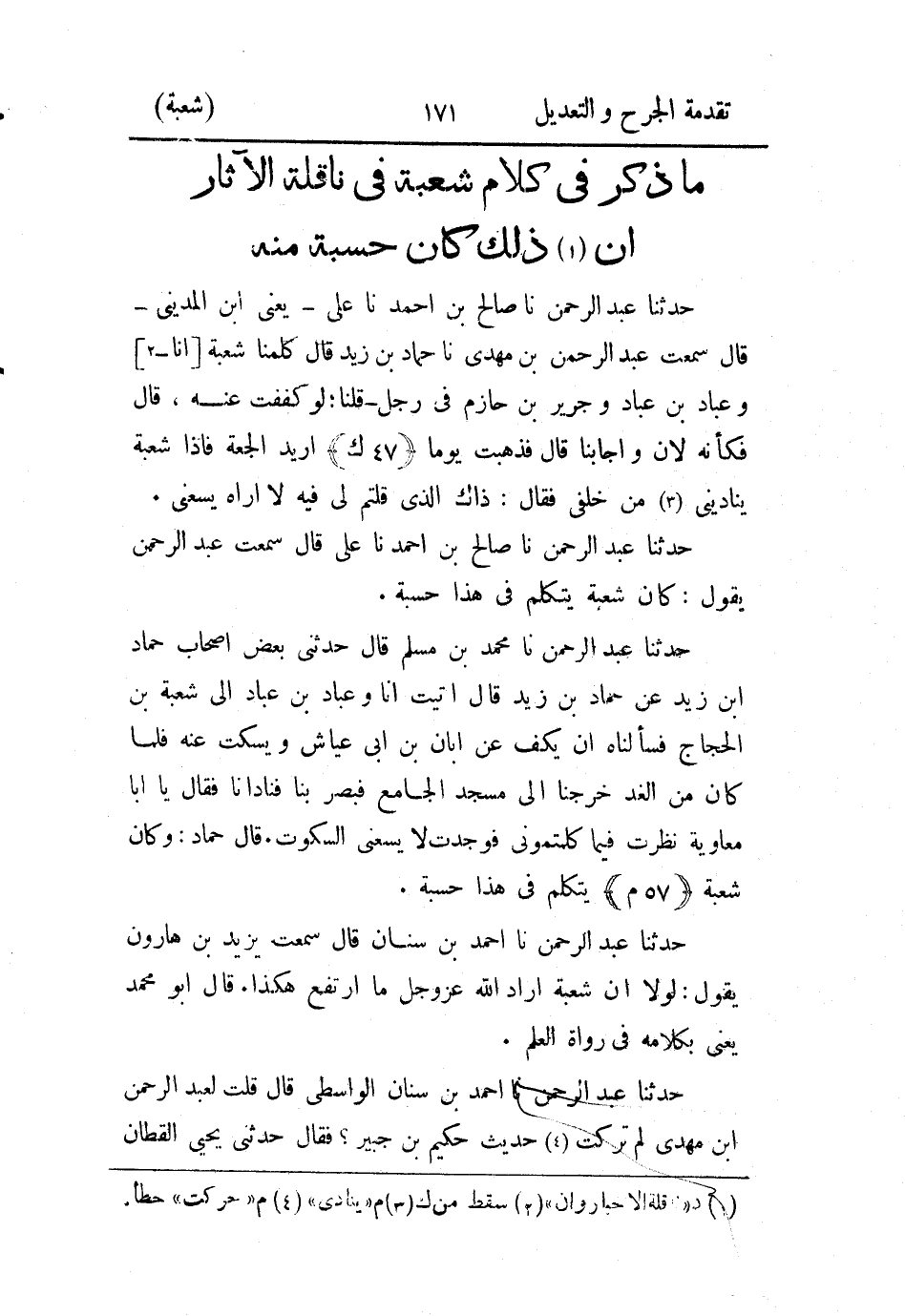 حَدثنا عَبد الرَّحمن، حَدثنا صالح بن أَحمد، حَدثنا علي، قال: سَمِعتُ عَبد الرَّحمن يقول: كان شُعبة يتكلم في هذا حسبة.