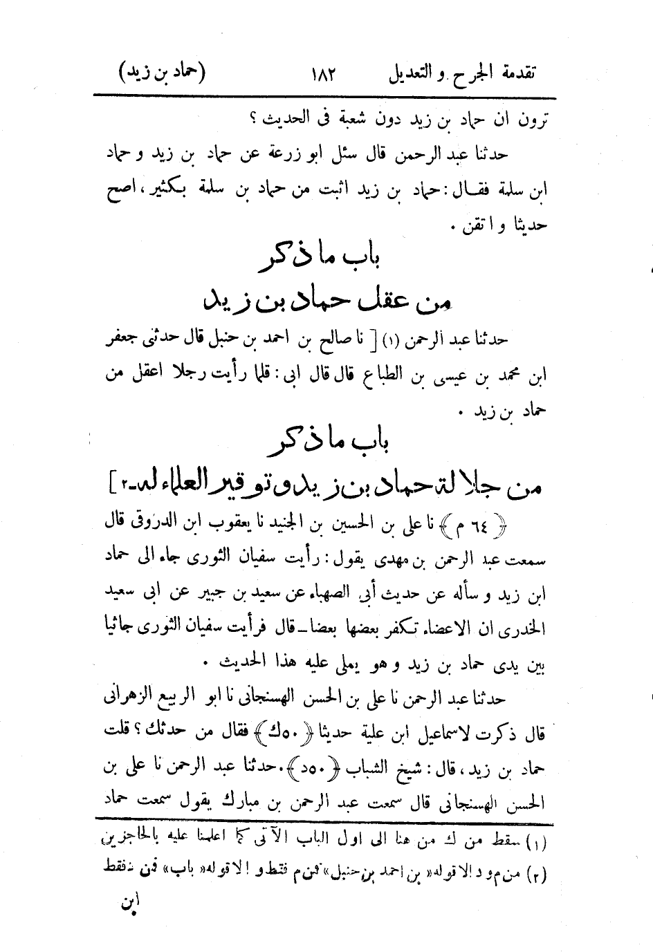 حَدثنا عَبد الرَّحمن، حَدثنا علي بن الحسن الهِسِنجَاني، حَدثنا أَبو الربيع الزهراني، قال: ذكرتُ لإسماعيل ابن علية حديثا فقال من حدثك؟ قلت حماد بن زيد، قال: شيخ الشباب.