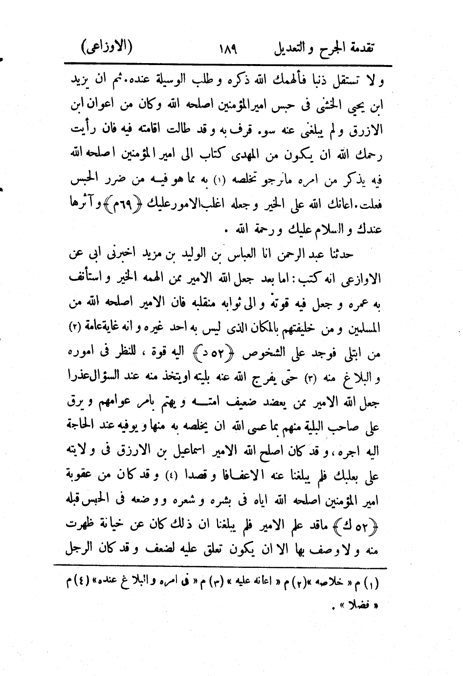 حَدثنا عَبد الرَّحمن، أَخبَرنا العباس بن الوليد بن مزيد أَخْبَرني أبي عن الأَوزاعي أَنه كتب: أما بعد جعل الله الأمير ممن ألهمه الخير واستأنف به عمره وجعل فيه قوته وإلي ثوابه منقلبه فإِن الأمير أصلحه الله من المسلمين ومن خليفتهم بالمكان الذي ليس به أحد غيره وأنه غاية عامة من إبتلي فوجد على الشخوص إِليه قوة، للنظر في أموره والبلاغ منه حتى يفرج الله عنه بليته، أَو يتخذ منه عند السؤال عذرا جعل الله الأمير ممن يعضد ضعيف أمته ويهتم بأمر عوامهم ويرق على صاحب البلية منهم بما عسى الله أَن يخلصه به منها ويوفيه عند الحاجة إِليه أجره، وقد كان أصلح الله الأمير إِسماعيل بن الأرزق في ولايته على بعلبك فلم يبلغنا عنه إِلاَّ عفافا وقصدا وقد كان من عقوبة أمير المؤمنين أصلحه الله إياه في بشره وشعره ووضعه في الحبس قبله ما قد علم الأمير فلم يبلغنا أَن ذلك كان عن خيانة ظهرت منه، ولا وصف بها إِلاَّ أَن يكون تعلق عليه لضعف وقد كان الرجل إِذا ولي ثم عزل فبلى منه أمانة حمد وخلى سبيله، أَو حبس فاستعين به فإِن رأى الأمير أَن يهتم بأمره ويُعرف حاله في العذر ومبلغه من السن فيكلم أمير المؤمنين في سراحه وتخلية سبيله فعل فإِن الأمير من يعرف أمير المؤمنين نصحه وفضله إِذا تدبر رأيه، وهو من لا يخاف جبيهته، ولا غلظته وما أدي الأمير إِليه من حق رعيته فسيجده عند الثواب موفرا وجزائه به مضعفا إِن شاء الله.