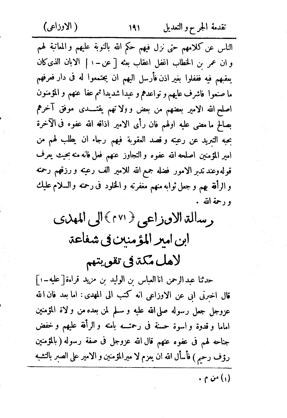 حَدثنا عَبد الرَّحمن، أَخبَرنا العباس بن الوليد بن مزيد قراءة عَليه قال أَخْبَرني أبي عن الأَوزاعي أَنه كتب إلى المهدي: أما بعد فإِن الله عز وجل جعل رسوله الله صَلى الله عَليه وسَلم لمن بعده من ولاة المؤمنين إماما وقدوة وأسوة حسنة في رحمته بأمته والرأفة عليهم وخفض جناحه لهم في عفوه عنهم قال الله عز وجل في صفة رسوله بالمؤمنين رؤف رحيم فأسأل الله أَن يعزم لأمير المؤمنين والأمير على الصبر بالتشبه بنبيه صَلى الله عَليه وسَلم والإعتصام بسنته ومنافسة الأخيار أعمال البر ويجعل ثوابهما في يوم البعث الأمن والإفضاء إلى رضوان الله عز وجل.