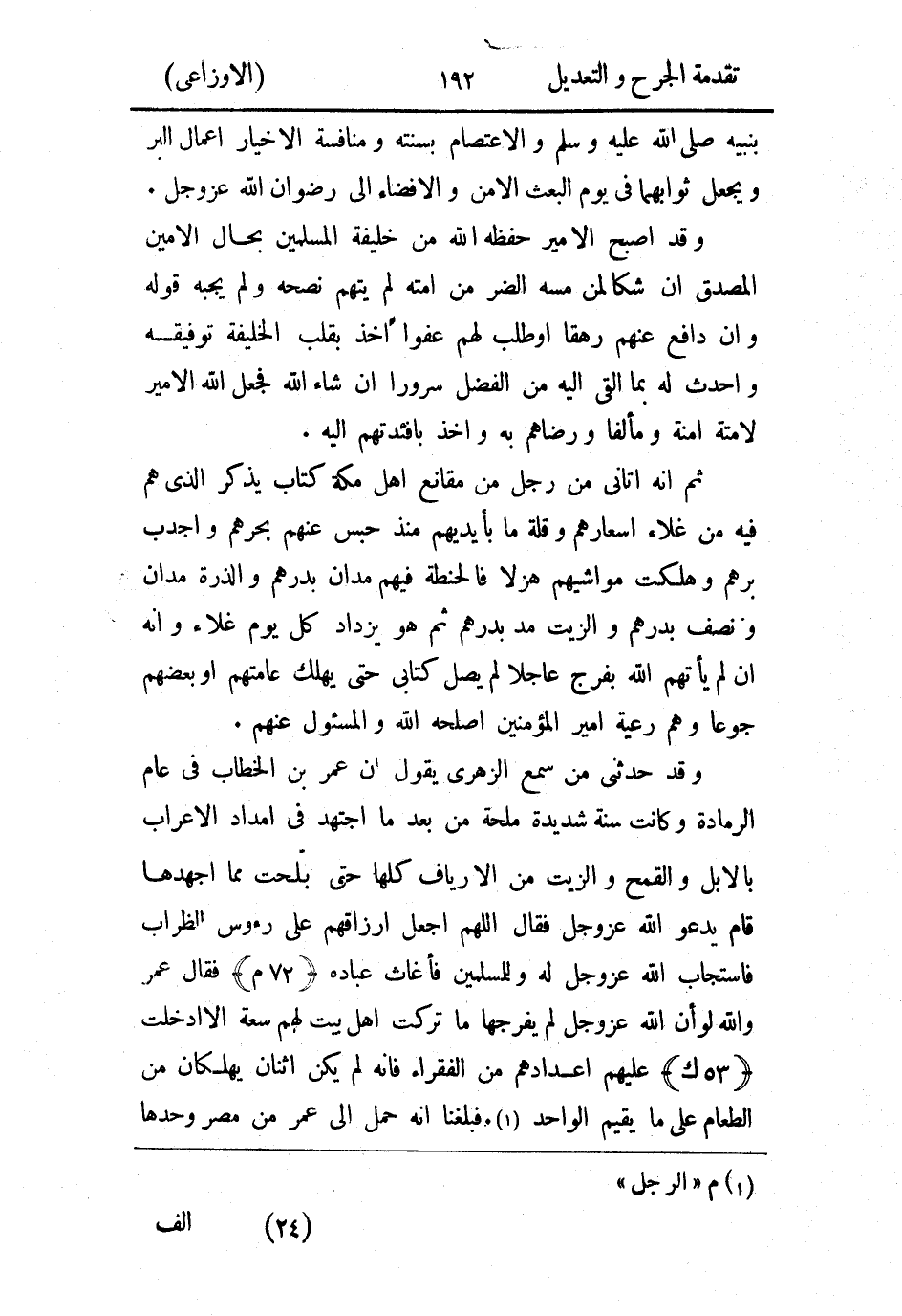 وقد حدثني من سمع الزُّهْري يقول أَن عُمر بن الخطاب في عام الرمادة وكانت سنة شديدة ملحة من بعد ما إجتهد في إمداد الأعراب بالإِبل والقمح والزيت من الأرياف كلها حتى بلحت مما أجهدها قام يدعو الله عز وجل فقال اللهم اجعل أرزاقهم على رؤوس الظراب فاستجاب الله عز وجل له وللمسلمين فأغاث عباده فقال عُمر والله لو أَن الله عز وجل لم يفرجها ما تركت أهل بيت لهم سعة إِلاَّ أدخلت عليهم أعدادهم من الفقراء فإِنه لم يكن اثنان يهلكان من الطعام على ما يقيم الواحد. فبلغنا أَنه حمل إلى عُمر من مصر وحدها ألف ألف أردب، وبلغنا أَن رسول الله صَلى الله عَليه وسَلم قال: هل عسى أحدكم أَن تبيت فصاله رواء وجاره طاو إلى جنبه؟ فإِن رأى الأمير أصلحه الله أَن يلح على أمير المؤمنين في إغاثة أهل مكة ومن حولهم من المسلمين في بره وبحره بحمل الطعام والزيت إِليهم قبل أَن يبتلى بهلاك أحَد منهم جوعا فعل.