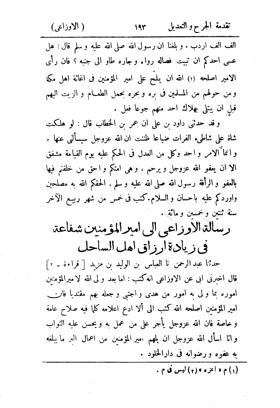 - رسالة الأَوزاعي إلى أمير المؤمنين شفاعة في زيادة أرزاق أهل الساحل.