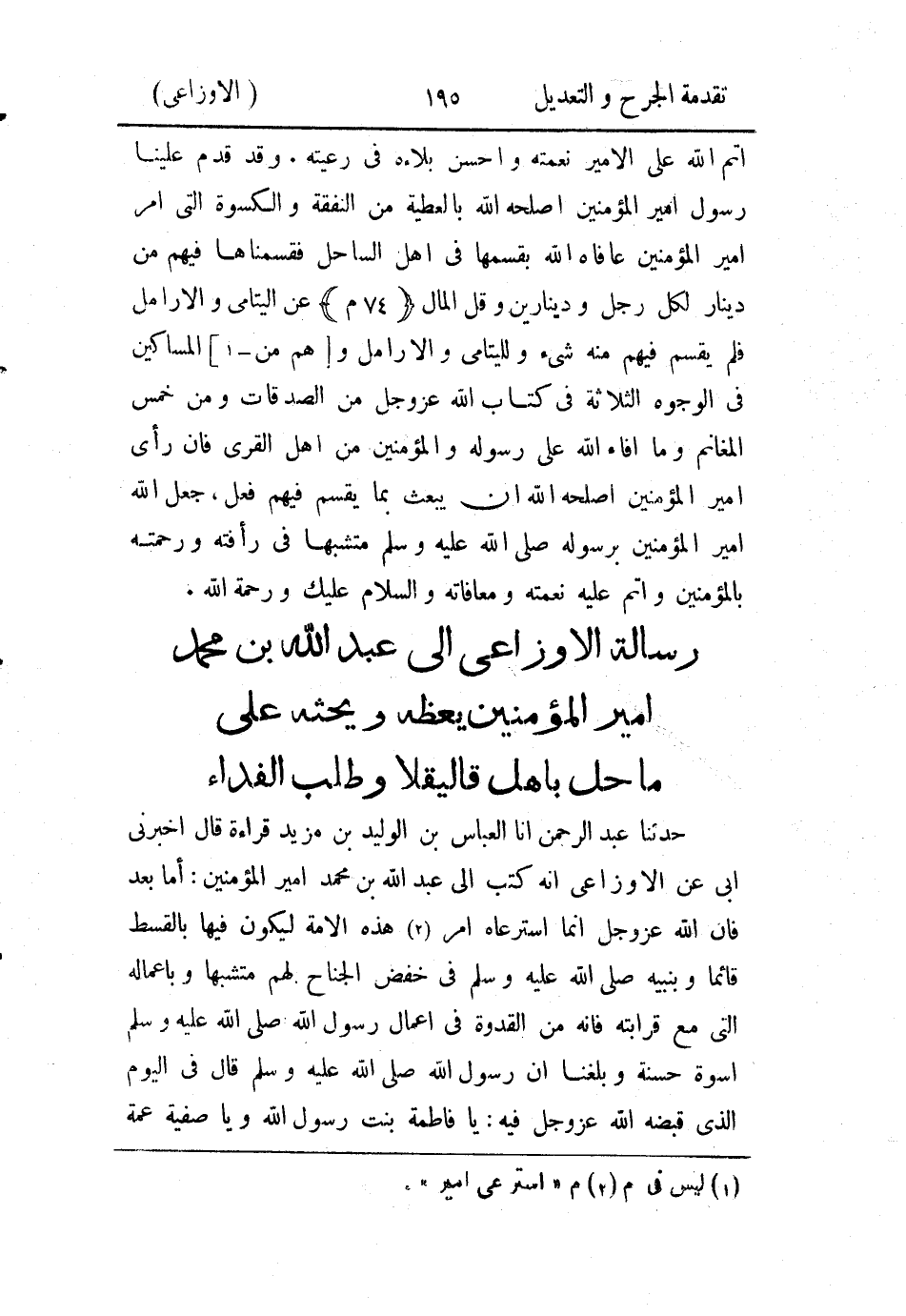 حَدثنا عَبد الرَّحمن، أَخبَرنا العباس بن الوليد بن مزيد قراءة قال أَخْبَرني أبي عن الأَوزاعي أَنه كتب إلى عَبد الله بن محمد أمير المؤمنين؛ أما بعد، فإِن الله عز وجل إِنما إسترعاه أَمر هذه الأُمة ليكون فيها بالقسط قائما وبنبيه صَلى الله عَليه وسَلم في خفض الجناح لهم متشبها وبأعماله التي مع قرابته فإِنه من القدوة في أعمال رسول الله صَلى الله عَليه وسَلم أُسوة حسنة وبلغنا أَن رسول الله صَلى الله عَليه وسَلم قال في اليوم الذي قبضه الله عز وجل فيه: يا فاطمة بنت رسول الله، ويا صفية عمة رسول الله إعملا لما عند الله عز وجل فإِني لا أملك لكما من الله شيئًا.