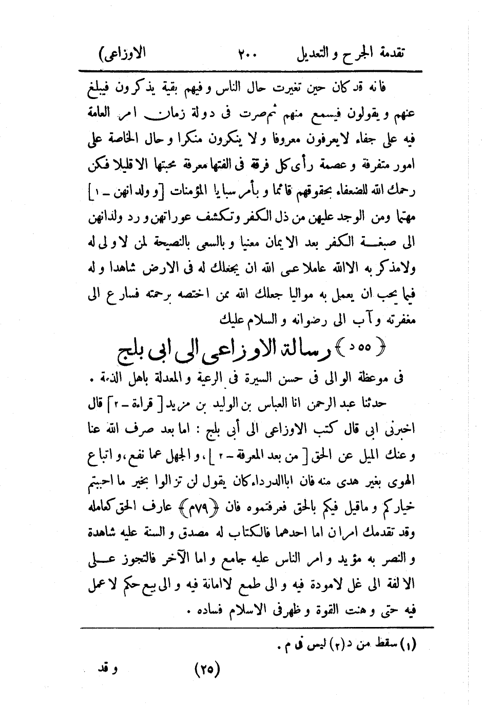 حَدثنا عَبد الرَّحمن، أَخبَرنا العباس بن الوليد بن مزيد قراءة، قال: أَخْبَرني أَبي، قال: كتب الأَوزاعي إلى أبي بلج: أما بعد؛