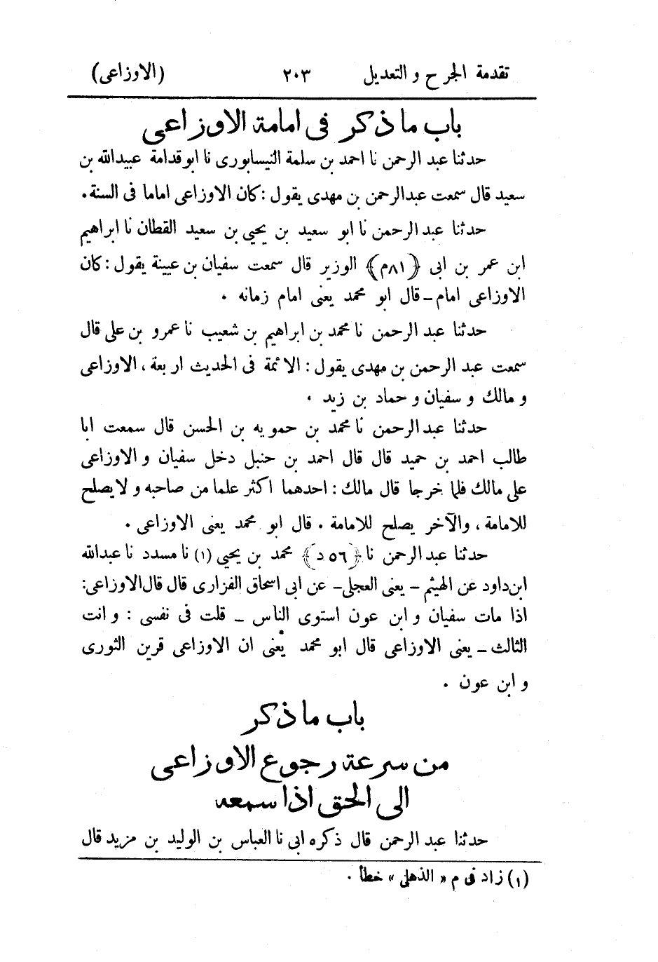 - باب ما ذكر من سرعة رجوع الأَوزاعي إلى الحق إِذا سمعه.