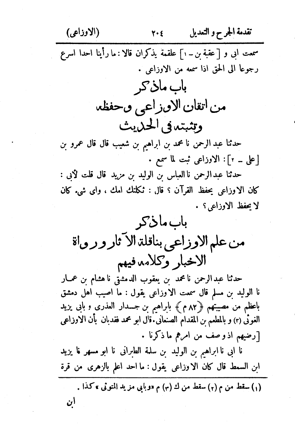 - باب ما ذكر من علم الأَوزاعي بناقلة الآثار ورواة الأخبار وكلامه فيهم.
