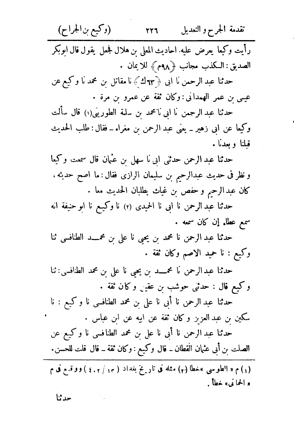 حَدثنا عَبد الرَّحمن، حَدثنا محمد بن يحيى، حَدثنا علي بن محمد الطنافسي حَدثنا وكيع: حَدثنا حميد الأَصم، وكان ثقةً.