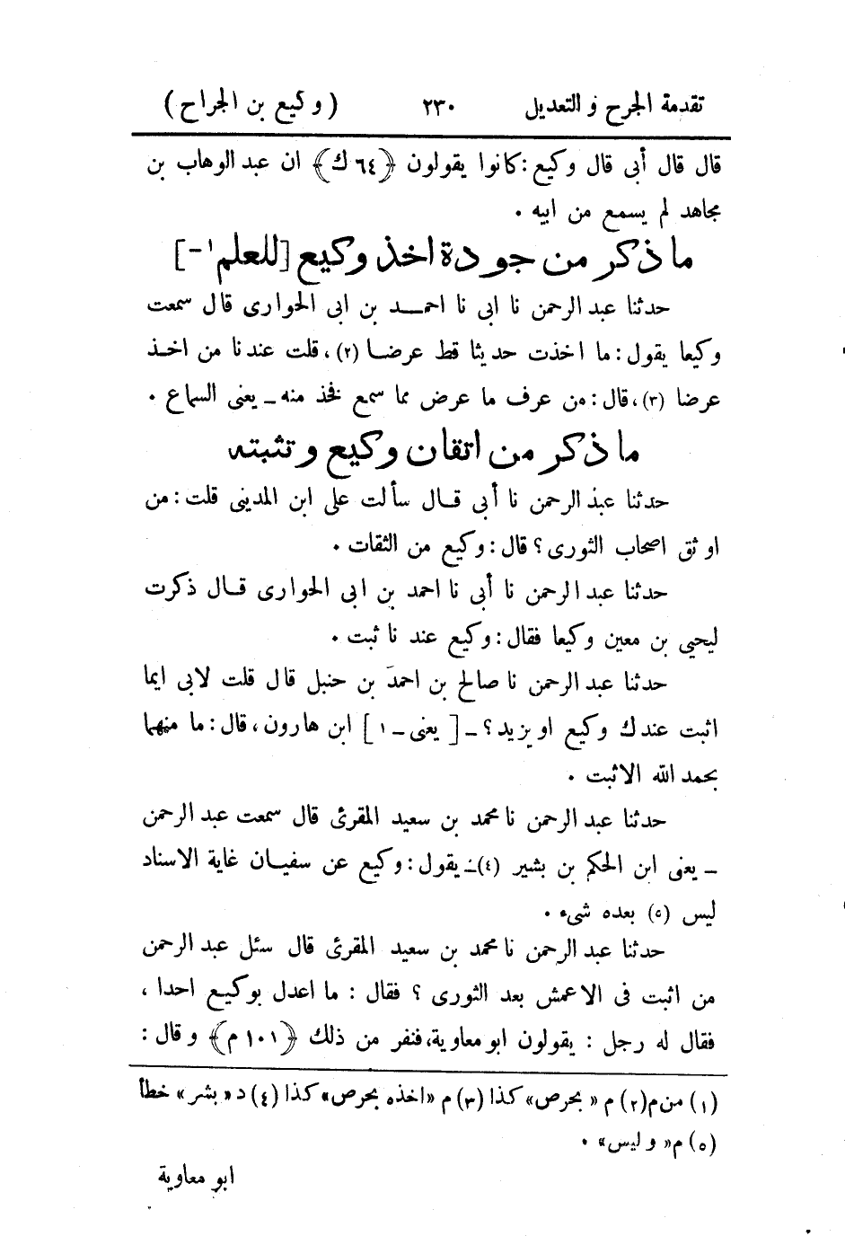حَدثنا عَبد الرَّحمن، حَدثنا أَبي، حَدثنا أَحمد بن أَبي الحواري، قال: سَمِعتُ وَكيعًا يقول: ما أخذت حديثا قط عرضا، قلت عندنا من أخذ عرضا، قال: من عرف ما عرض مما سمع فخذ منه، يَعني السماع.
