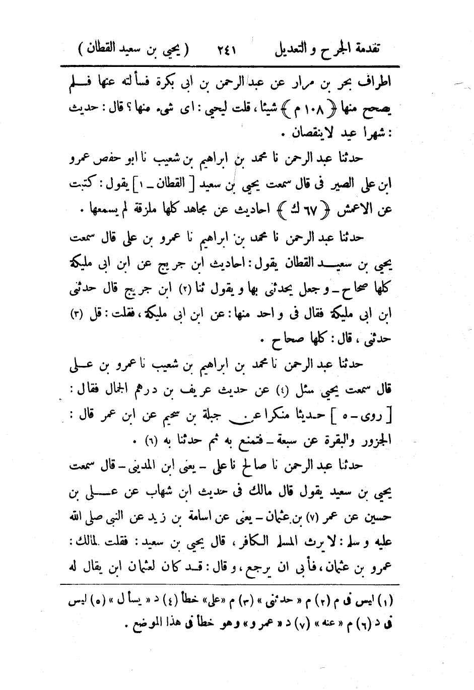 حَدثنا عَبد الرَّحمن، حَدثنا محمد بن إِبراهيم بن شُعيب، حَدثنا أَبو حفص عَمرو بن علي الصيرفي، قال: سَمِعتُ يَحيَى بن سَعيد القطان يقول: كتبت عن الأَعمش أحاديث عن مجاهد كلها ملزقة لم يسمعها.