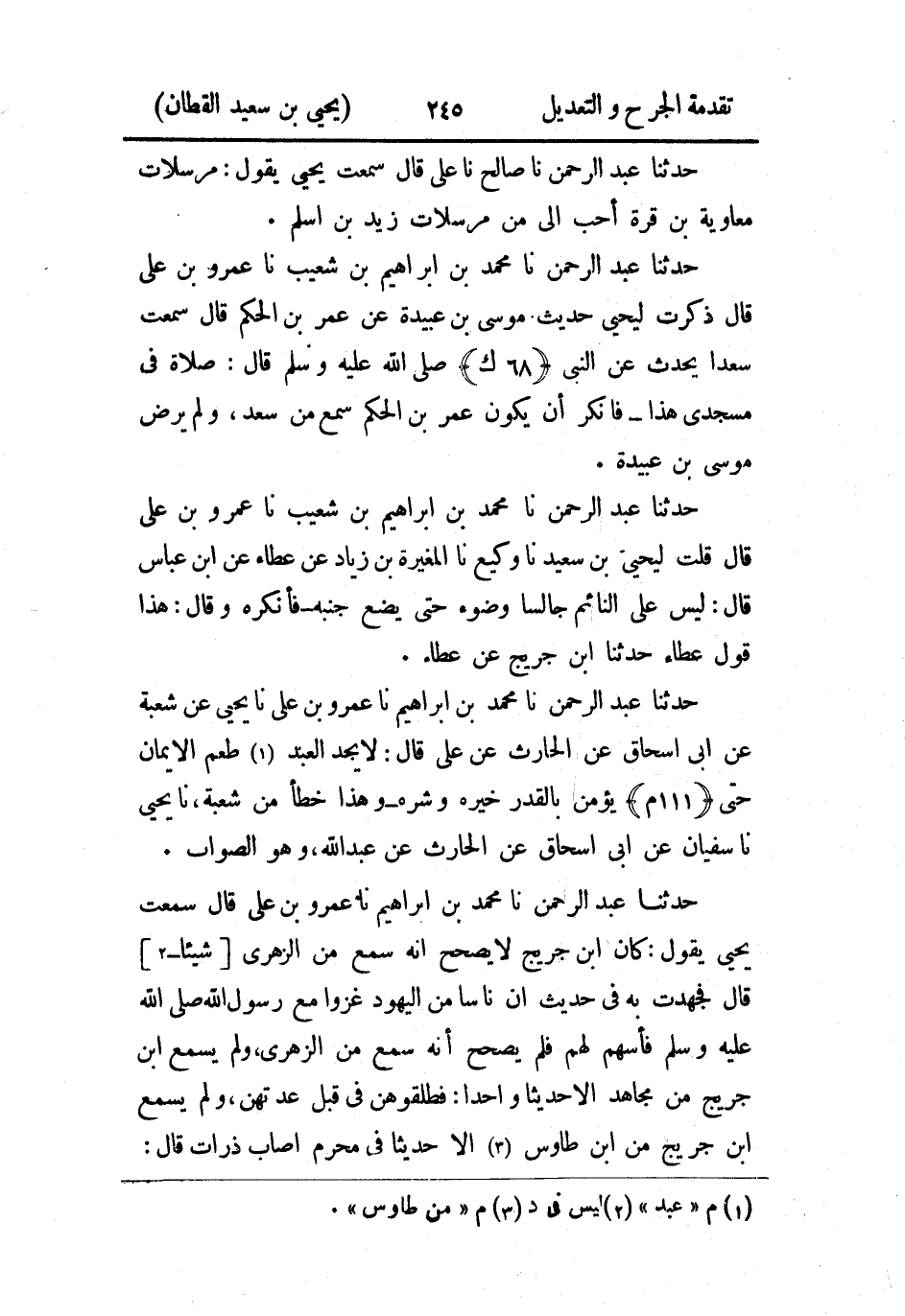 حَدثنا عَبد الرَّحمن، حَدثنا محمد بن إِبراهيم، حَدثنا عَمرو بن علي، قال: سَمِعتُ يَحيَى يقول: كان ابن جُرَيج لا يصحح أَنه سمع من الزُّهْري شيئا قال فجهدت به في حديث أَن ناسًا من اليهود غزوا مع رسول الله صَلى الله عَليه وسَلم فأسهم لهم فلم يصحح أَنه سمع من الزُّهْري، ولم يسمع ابن جُرَيج من مجاهد إِلاَّ حديثا واحدا: فطلقوهن في قبل عدتهن، ولم يسمع ابن جُرَيج من ابن طاوُوس إِلاَّ حديثا في محرم أصاب ذرات قال فيها قبضات من طعام، ولم يسمع الحجاج بن أرطاة من الشعبي إِلاَّ حديثا: لا تجوز صدقة حتى تقبض.