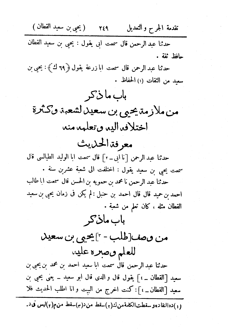 - باب ما ذكر من ملازمة يَحيَى بن سَعيد لشُعبة وكثرة إختلافه إِليه وتعلمه منه معرفة الحديث.