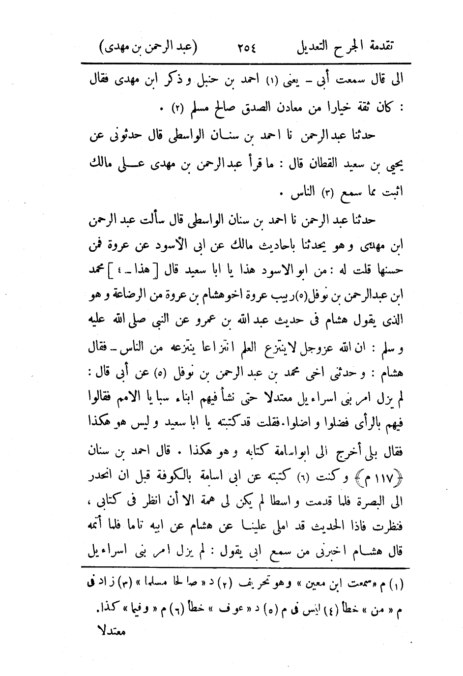 حَدثنا عَبد الرَّحمن، حَدثنا أَحمد بن سنان الواسطي، قال: سأَلتُ عَبد الرَّحمن بن مهدي، وهو يُحَدِّثنا بأَحاديث مالك، عَن أَبي الأَسود، عن عُروَة فمن حسنها قلتُ له: من أَبو الأَسود هذا يا أَبَا سَعيد قال هذا مُحمد بن عَبد الرَّحمن بن نوفل ربيب عُروَة أَخو هشام بن عُروَة من الرضاعة، وهو الذي يقول هشام في حديث عَبد الله بن عَمرو، عَن النَّبي صَلى الله عَليه وسَلم: إِن الله عز وجل لا ينتزع العلم إنتزاعا ينتزعه من الناس، فقال هشام: وحدثني أَخي محمد بن عَبد الرَّحمن بن نوفل، عَن أَبي قال: لم يزل أَمر بني إِسرائيل معتدلا حتى نشأ فيهم أبناء سبايا الأمم فقالوا فيهم بالرأي فضلوا وأضلوا فقلت قد كتبته يا أَبَا سَعيد وليس هو هكذا فقال بلى أخرج إلى أَبو أُسامة كتابه، وهو هكذا قال أَحمد بن سنان وكنت كتبته، عَن أَبي أُسامة بالكوفة قبل أَن أنحدر إلى البصرة فلما قدمت واسطا لم يكن لي همة إِلاَّ أَن أَنظر في كتابي، فنظرت فإذا الحديث قد أملي علينا عن هشام، عَن أَبيه تاما فلما أتمه قال هشام أَخْبَرني من سمع أبي يقول: لم يزل أَمر بني إِسرائيل معتدلا حتى ذكر الحديث بتمامه.