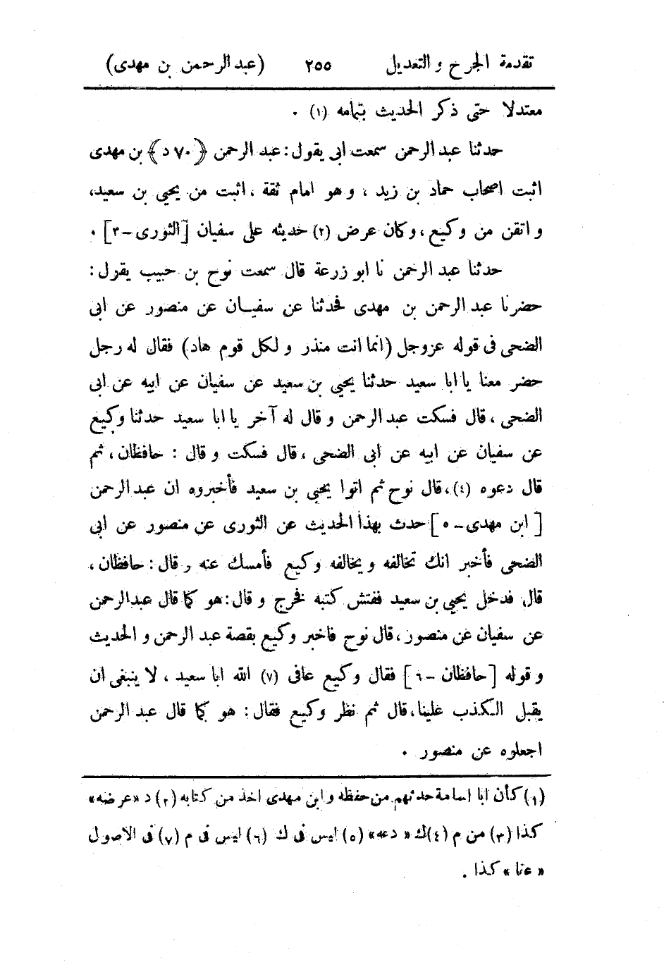 حَدثنا عَبد الرَّحمن سَمِعتُ أَبي يقول: عَبد الرَّحمن بن مهدي أثبت أَصحاب حماد بن زيد، وهو إمام ثقة، أثبت من يَحيَى بن سعيد، وأتقن من وكيع، وكان عرض حديثه على سُفيان الثَّوري.