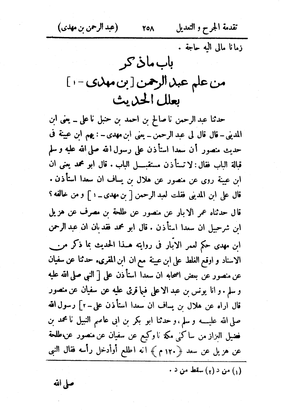 قال علي بن المَدينيّ: فقلت لعبد الرَّحمن بن مهدي ومن خالفه؟ قال: حَدثناه عُمر الأبار، عن منصور، عَن طلحة بن مصرف، عن هزيل بن شرحبيل؛ أَن سعدا إستأذن.