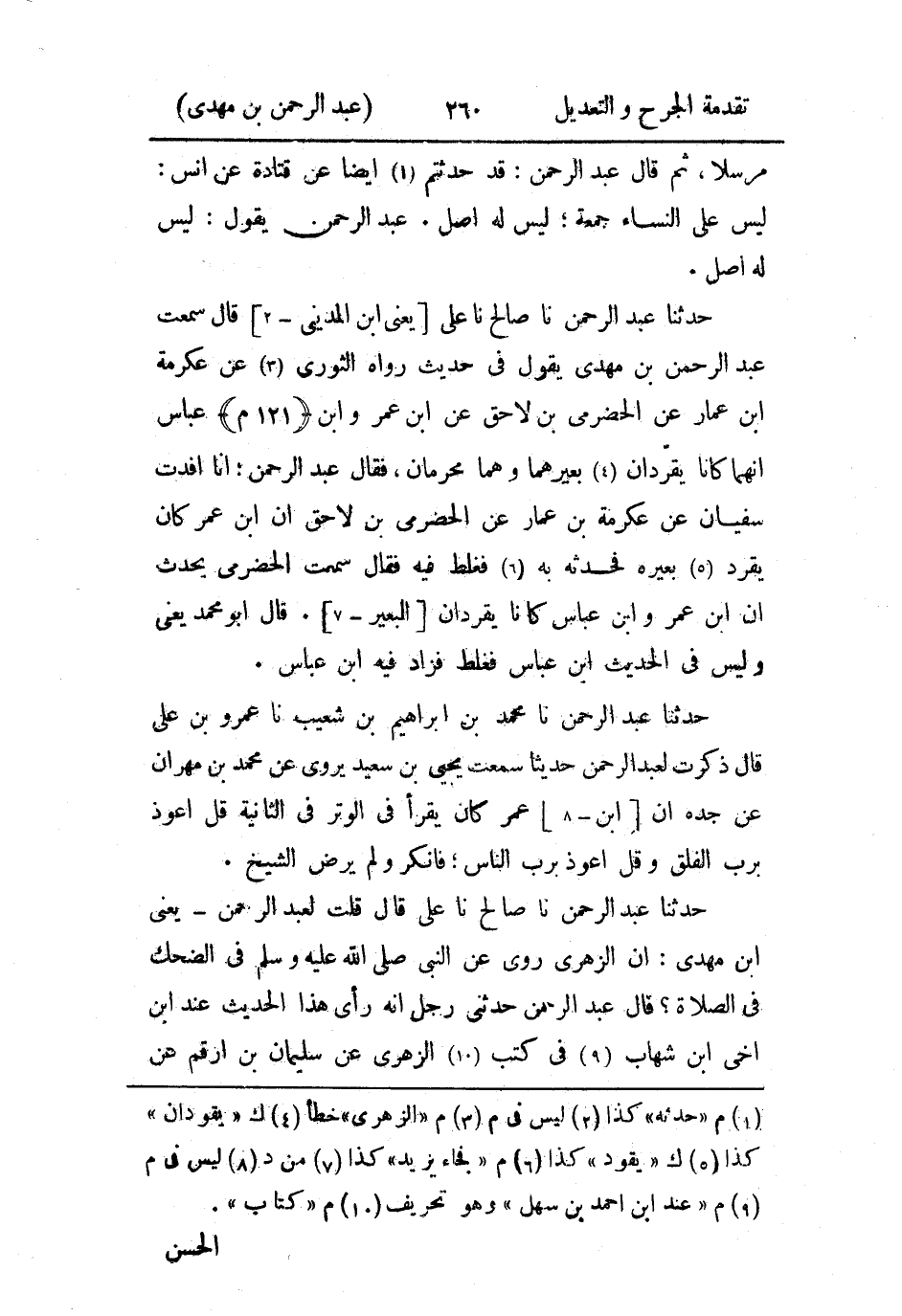 حَدثنا عَبد الرَّحمن، حَدثنا صالح، حَدثنا علي، قال: قلتُ لعبد الرَّحمن، يَعني ابن مهدي: إِن الزُّهْري روى عن النَّبي صَلى الله عَليه وسَلم في الضحك في الصلاة؟ قال عَبد الرَّحمن: حدثني رجل أَنه رأى هذا الحديث عند ابن أَخي ابن شهاب في كتب الزُّهْري، عن سليمان بن أَرقم، عن الحسن، قلت لعبد الرَّحمن: إِن الزُّهْري كانت له مرسلات رديئة وأفسدت على مرسلاته، حين ذكر أَنه روى هذا الحديث، عن سليمان بن أَرقم، عن الحسن.
