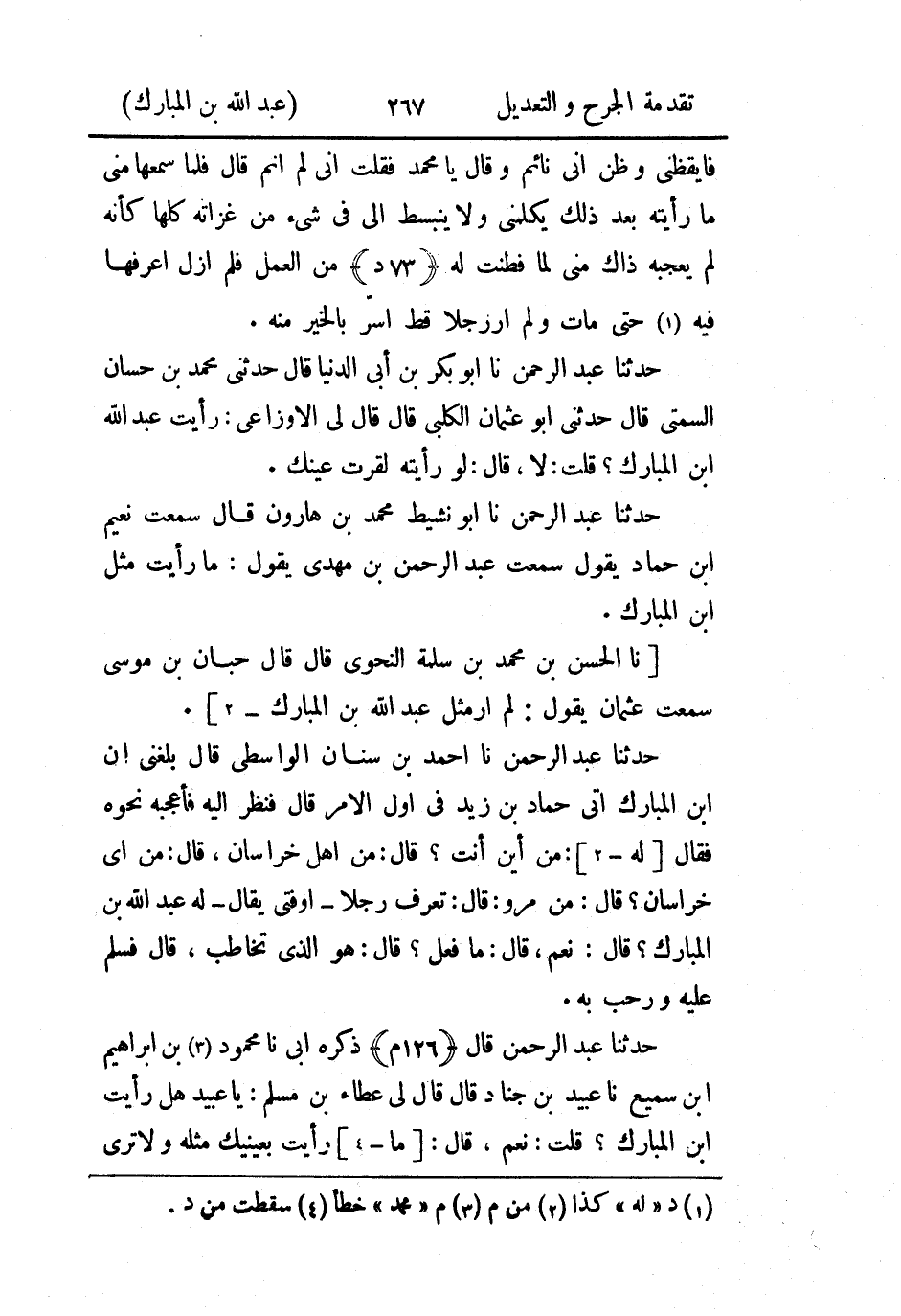 حَدثنا عَبد الرَّحمن، حَدثنا أَحمد بن سنان الواسطي قال بلغني أَن ابن المبارك أتى حماد بن زيد في أول الأمر قال فنظر إِليه فأعجبه نحوه فقال له: من أين أَنت؟ قال: من أهل خراسان، قال: من أي خراسان؟ قال: من مرو: قال: تعرف رجلاً، أَوْ فتى يقال، له عَبد الله بن المبارك؟ قال: نعم قال: ما فعل؟ قال: هو الذي تخاطب، قال فسلم عليه ورحب به.