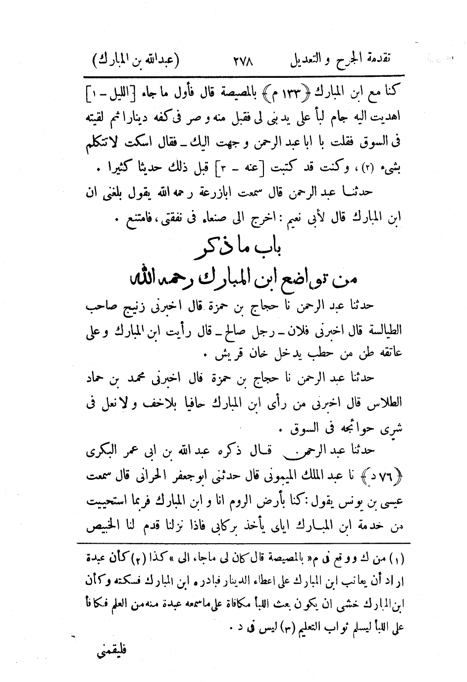 حَدثنا عَبد الرَّحمن، حَدثنا حجاج بن حمزة قال أَخْبَرني محمد بن حماد الطلاس قال أَخْبَرني من رأى ابن المبارك حافيا بلا خف، ولا نعل في شرى حوائجه في السوق.