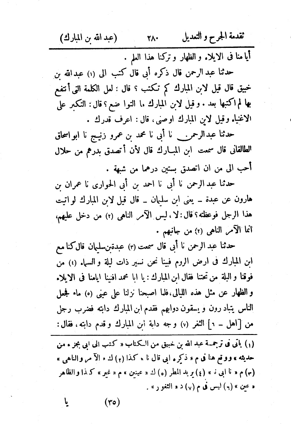 حَدثنا عَبد الرَّحمن، حَدثنا أَبي، قال: سَمِعتُ عَبدَة بن سُليمان قال كنا مع ابن المبارك في أرض الروم فبينا نحن نسير ذات ليلة والسماء من فوقنا والبلة من تحتنا فقال ابن المبارك: يا أَبَا محمد أفنينا أيامنا في الإيلاء والظهار عن مثل هذه الليالي، فلما أصبحنا نزلنا على عيني ماء فجعل الناس يتبادرون ويسقون دوابهم فقدم ابن المبارك دابته فضرب رجل من أهل الثغر وجه دابة ابن المبارك وقدم دابته، فقال: يا أَبَا محمد المنافسة في مثل هذا الموضع ليس في الموضع الذي إِذا رأونا قالوا وسعوا لأَبي عَبد الرَّحمن، إرتفع يا أَبَا عَبد الرَّحمن.