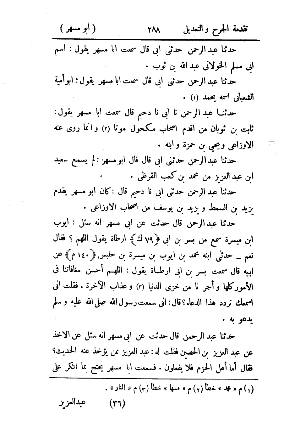 حَدثنا عَبد الرَّحمن، قال: حدثت، عَن أَبي مُسهر؛ أَنه سئل عن الأخذ عن عَبد العزيز بن الحصين فقلتُ له: عَبد العزيز ممن يؤخذ عنه الحديث؟ فقال: أما أهل الحزم فلا يفعلون.