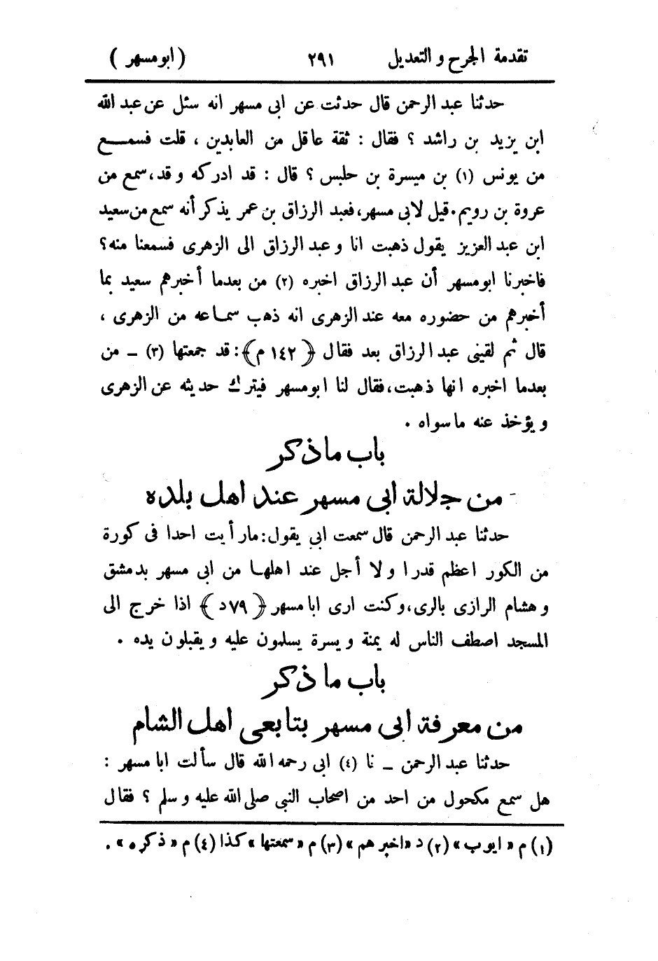 حَدثنا عَبد الرَّحمن، قال: حدثت، عَن أَبي مُسهر، أَنه سئل عن عَبد الله بن يزيد بن راشد؟ فقال: ثقة عاقل من العابدين، قلت: فسمع من يُونُس بن ميسرة بن حلبس؟ قال: قد أدركه وقد سمع من عُروَة بن رويم، قيل لأَبي مُسهر: فعبد الرَّزاق بن عُمر يذكر أَنه سمع من سَعيد بن عَبد العزيز، يقول: ذهبت أنا، وعَبد الرَّزاق إلى الزُّهْري فسمعنا منه؟ فأَخبَرنا أَبو مُسهر أَن عَبد الرَّزاق أخبره من بعد ما أخبرهم سَعيد بما أخبرهم من حضوره معه عند الزُّهْري، أَنه ذهب سماعه من الزُّهْري، قال: ثم لقيني عَبد الرَّزاق بعد، فقال: قد جمعتها من بعد ما أخبره أنها ذهبت، فقال لنا أَبو مُسهر: فيترك حديثه عن الزُّهْري ويؤخذ عنه ما سواه.