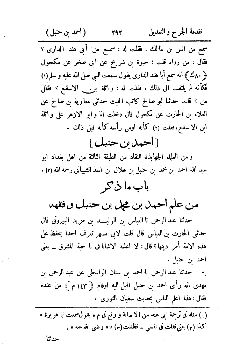 - ومن العلماء الجهابذة النقاد من الطبقة الثالثة من أهل بغداد أَبو عَبد الله أَحمد بن محمد بن حَنبل بن هلال بن أَسد الشَيباني رحمه الله.