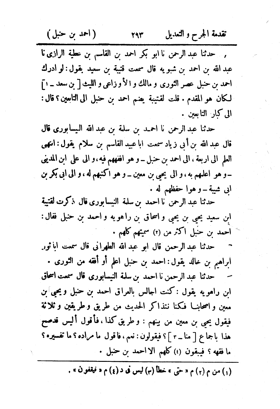 حَدثنا عَبد الرَّحمن، حَدثنا أَحمد بن سلمة بن عَبد الله النيسابوري قال: قال عَبد الله بن أَبي زياد سَمِعتُ أبَا عُبَيد القاسم بن سلام يقول: إنتهى العلم إلى أربعة، إلى أَحمد بن حَنبل، وهو أفقههم فيه، وإلى علي بن المَديني، وهو أعلمهم به، وإلى يَحيَى بن مَعين، وهو أكتبهم له، وإلى أَبي بكر بن أَبي شيبة، وهو أَحفظهم له.