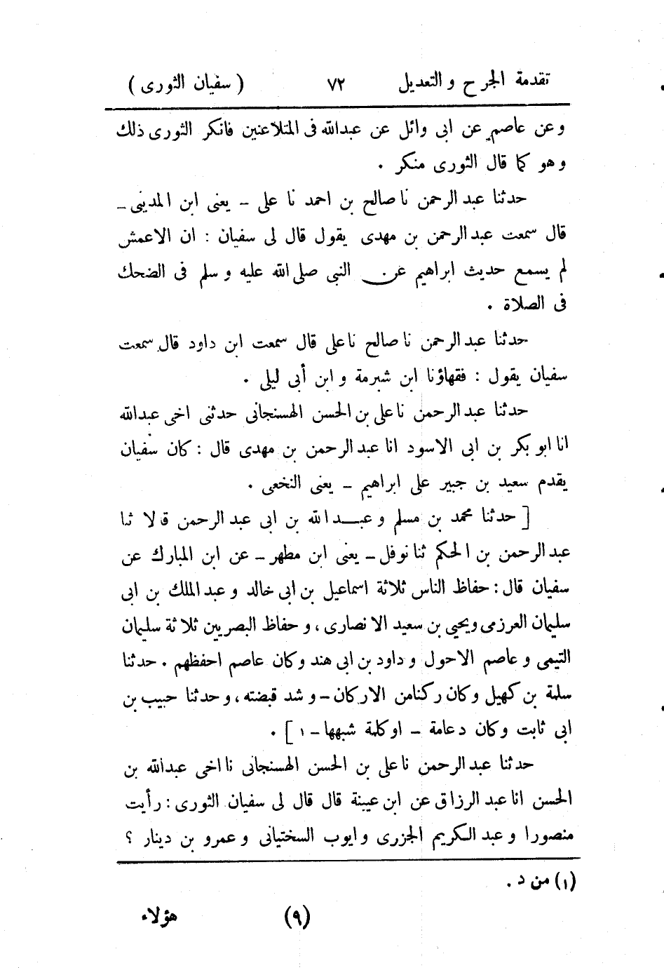 حَدثنا عَبد الرَّحمن، حَدثنا علي بن الحسن الهِسِنجَاني، حَدثنا أَخي عَبد الله بن الحسن، أَخْبَرنا عَبد الرَّزاق، عَن ابن عيينة قال: قال لي سُفيان الثَّوريّ: رأَيت منصورا، وعَبد الكريم الجزري، وأَيوب السختياني، وعَمرو بن دينار؟ هؤلاء الأعين الذين لا يشك فيهم.