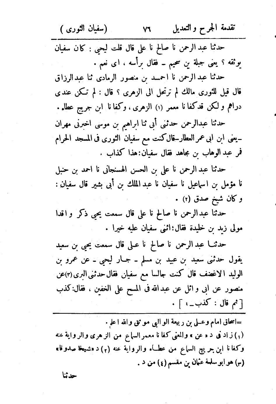 حَدثنا عَبد الرَّحمن، حَدثنا صالح، حَدثنا علي، قال: سَمِعتُ يَحيَى بن سَعيد يقول: حدثني سَعيد بن عُبَيد بن مسلم، جار ليحيى، عن عَمرو بن الوليد الأغضف قال: كنت جالسا مع سُفيان، فقال: حدثني البري عن منصور، عَن أبي وائل، عَن عَبد الله؛ في المسح على الخفين. فقال: كذب، ثم قال: كذب.
