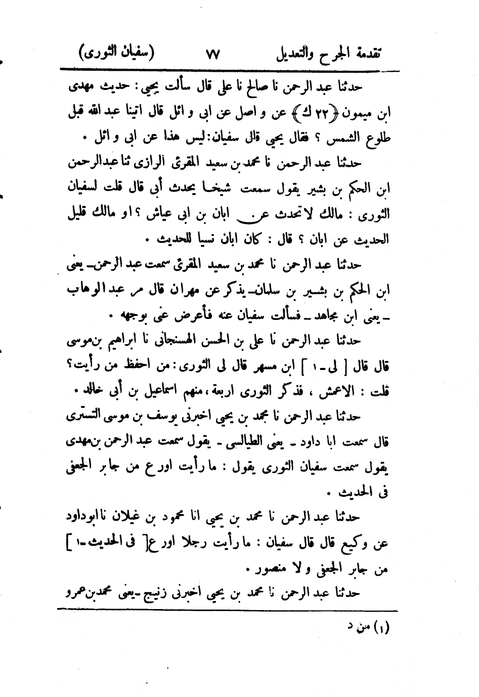 حَدثنا عَبد الرَّحمن، حَدثنا محمد بن يحيى، أَخْبَرني زنيج، يَعني محمد بن عَمرو الطيالسي، قال: سَمِعتُ يَحيَى بن الضريس يقول: كان سُفيان الثَّوري يدل على زائدة بن قدامه في كتاب الحديث.