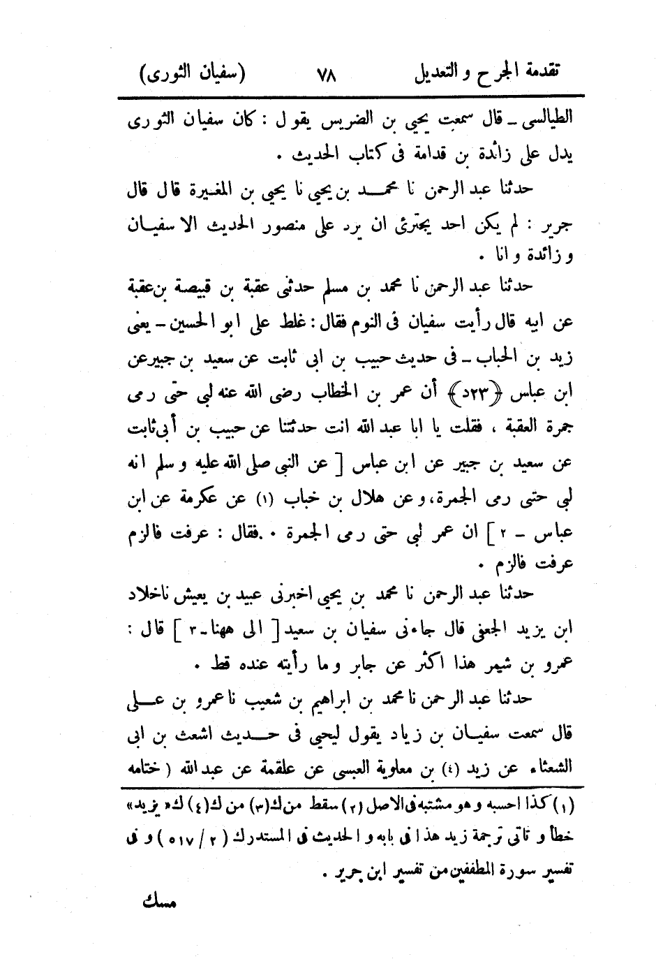 حَدثنا عَبد الرَّحمن، حَدثنا محمد بن مسلم، حدثني عقبة بن قَبيصَة بن عقبة، عَن أَبيه قال: رأَيت سُفيان في النوم فقال: غلط على أَبو الحسين، يَعني زيد بن الحُبَاب، في حديث حبيب بن أَبي ثابت، عن سَعيد بن جُبَير، عَن ابن عباس؛ أَن عُمر بن الخطاب، رَضي الله عَنهُ، لبى حتى رمى جمرة العقبة. فقلت: يا أَبَا عَبد الله، أَنت حدثتنا عن حبيب بن أَبي ثابت، عن سَعيد بن جُبَير، عَن ابن عباس، عن النَّبي صَلى الله عَليه وسَلم؛ أَنه لبى حتى رمى الجمرة. وَعن هلال بن خباب، عن عكرمة، عَن ابن عباس؛ أَن عُمر لبى حتى رمى الجمرة. فقال: عرفت فالزم، عرفت فالزم.
