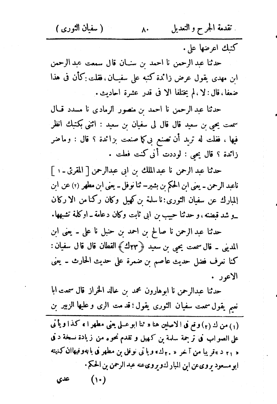 حَدثنا عَبد الرَّحمن، حَدثنا أَحمد بن سنان، قال: سَمِعتُ عَبد الرَّحمن بن مهدي يقول: عرض زائدة كتبه على سُفيان، فقلت: كأن في هذا ضعفا، قال: لا، لم يختلفا إِلاَّ في قدر عشرة أحاديث.