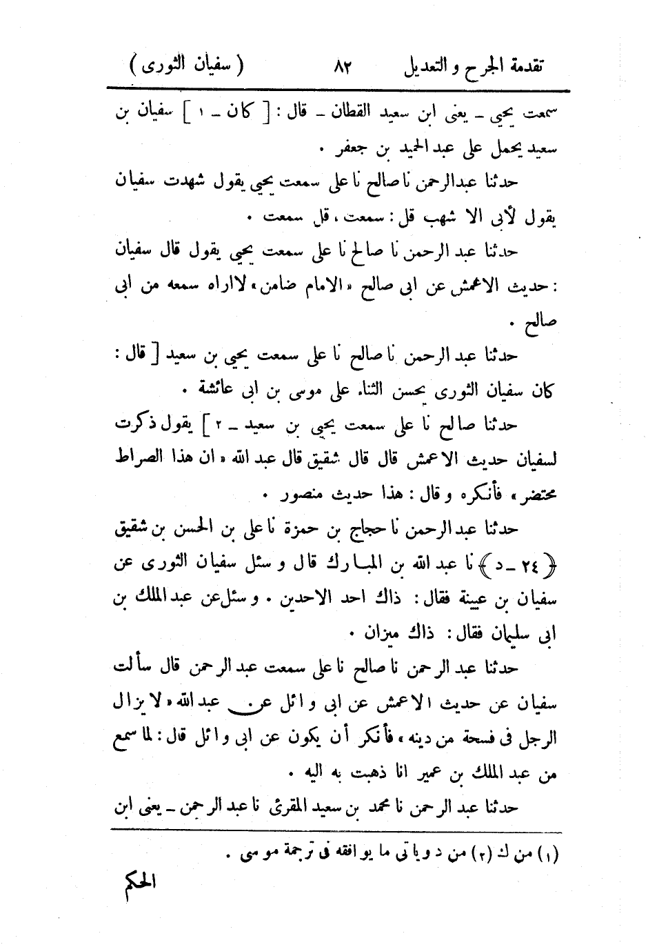 حَدثنا عَبد الرَّحمن، حَدثنا حجاج بن حمزة، حَدثنا علي بن الحسن بن شقيق، حَدثنا عَبد الله بن المبارك قال: وسئل سُفيان الثَّوري عن سُفيان بن عُيَينة، فقال: ذاك أحد الأَحَدَين، وسئل عن عَبد الملك بن أَبي سليمان فقال: ذاك ميزان.
