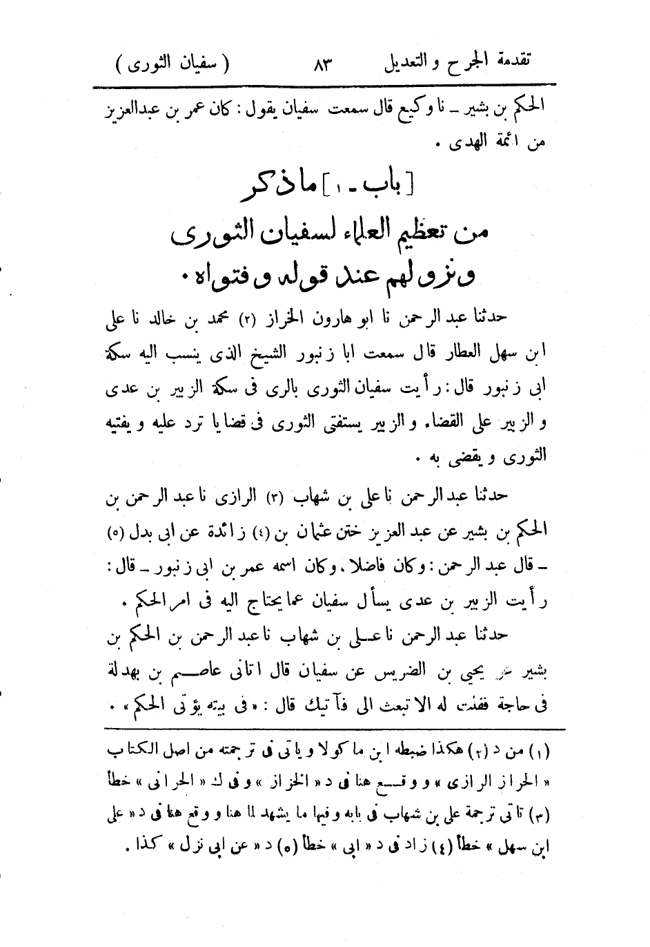 حَدثنا عَبد الرَّحمن، حَدثنا أَبو هارون الخراز محمد بن خالد، حَدثنا علي بن سهل العطار، قال: سَمِعتُ أبَا زنبور الشيخ الذي ينسب إِليه سكة أبي زنبور، قال: رأَيت سُفيان الثَّوري بالري في سكة الزبير بن عَدي والزبير على القضاء، والزبير يستفتي الثَّوري في قضايا ترد عليه، ويفتيه الثَّوري ويقضي به.