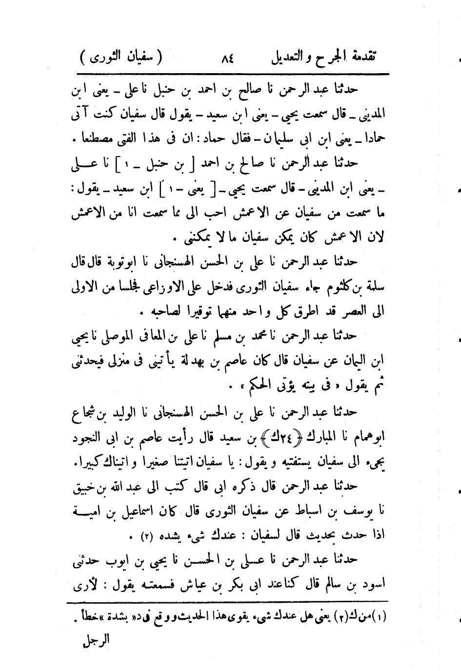 حَدثنا عَبد الرَّحمن، حَدثنا صالح بن أَحمد بن حَنبل، حَدثنا علي، يَعني ابن المَديني، قال: سَمِعتُ يحيى، يَعني ابن سعيد، يقول: ما سمعت من سُفيان عن الأَعمش، أَحَب إِلَيَّ مما سمعت أَنَا من الأَعمش، لأَن الأَعمش كان يمكن سُفيان ما لا يمكنني.