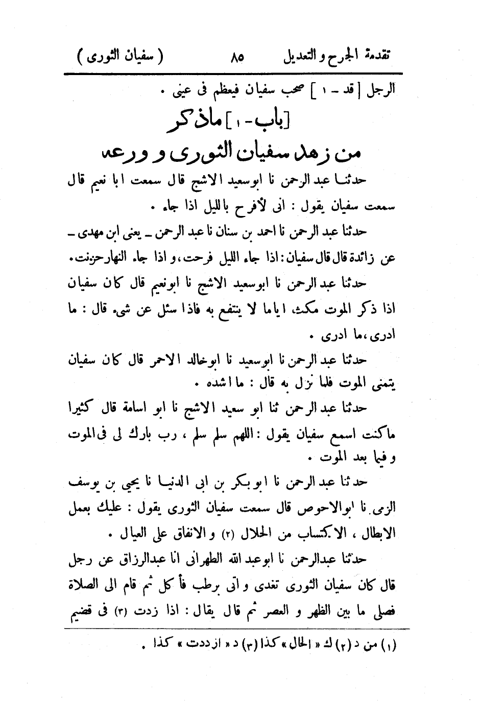 حَدثنا عَبد الرَّحمن، حَدثنا أَبو بكر بن أَبي الدنيا، حَدثنا يَحيَى بن يوسف الزمي، حَدثنا أَبو الأَحوص، قال: سَمِعتُ سُفيان الثَّوري يقول: عليك بعمل الأبطال، الإكتساب من الحلال، والإنفاق على العيال.