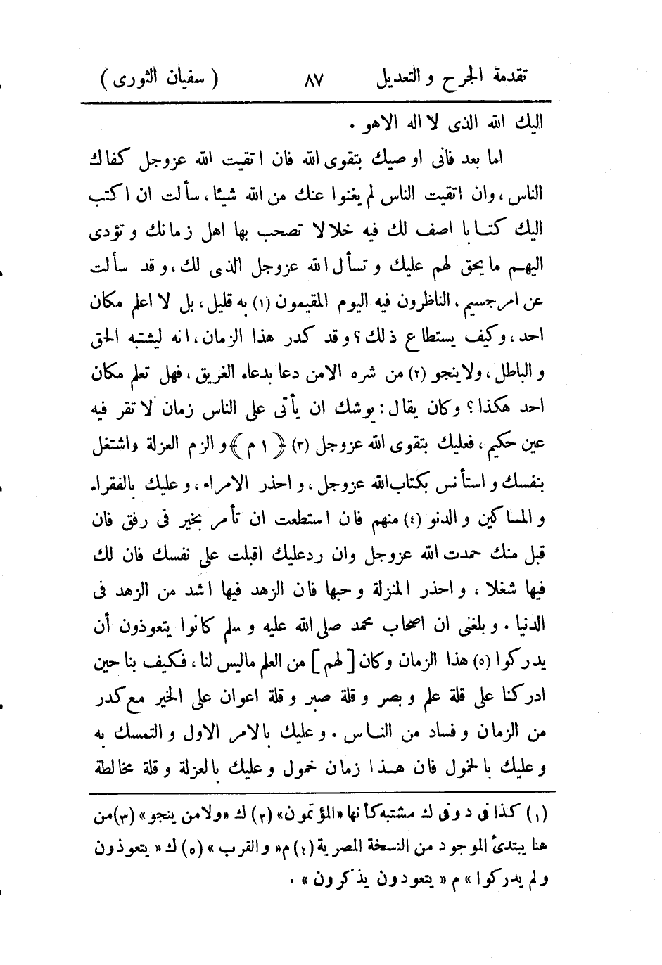 أما بعد؛ فإِني أوصيك بتقوى الله، فإِن إتقيت الله عز وجل كفاك الناس، وإن إتقيت الناس لم يغنوا عنك من الله شيئًا، سألت أَن أكتب إليك كتابًا أصف لك فيه خلالا تصحب بها أهل زمانك وتؤدي إِليهم ما يحق لهم عليك، وتسأل الله عز وجل الذي لك، وقد سألت عن أَمر جسيم، الناظرون فيه اليوم المقيمون به قليل، بل لاَ أعلمُ مكان أحد، وكيف يستطاع ذلك؟ وقد كدر هذا الزمان، أَنه ليشتبه الحق والباطل، ولا ينجو من شره إِلاَّ من دعا بدعاء الغريق، فهل تعلم مكان أحد هكذا؟ وكان يقال: يوشك أَن يأتي على الناس زمان لا تقر فيه عين حكيم، فعليك بتقوى الله عز وجل والزم العزلة واشتغل بنفسك واستأنس بكتاب الله عز وجل، واحذر الأمراء، وعليك بالفقراء والمساكين والدنو منهم، فان إستطعت أَن تأمر بخير في رفق فإِن قبل منك حمدت الله عز وجل، وإن رد عليك أقبلت على نفسك فإِن لك فيها شغلا، واحذر المنزلة وحبها فإِن الزهد فيها أشد من الزهد في الدنيا، وبلغني أَن أَصحاب محمد صَلى الله عَليه وسَلم كانوا يتعوذون أَن يدركوا هذا الزمان وكان لهم من العلم ما ليس لنا، فكيف بنا حين أدركنا على قلة علم وبصر وقلة صبر وقلة أعوان على الخير مع كدر من الزمان وفساد من الناس، وعليك بالأمر الأول والتمسك به وعليك بالخمول فإِن هذا زمان خمول وعليك بالعزلة وقلة مخالطة الناس فان عُمر بن الخطاب، رَضي الله عَنهُ قال: إياكم والطمع، فإِن الطمع فقر، واليأس غنى، وفي العزلة راحة من خلاط السوء،