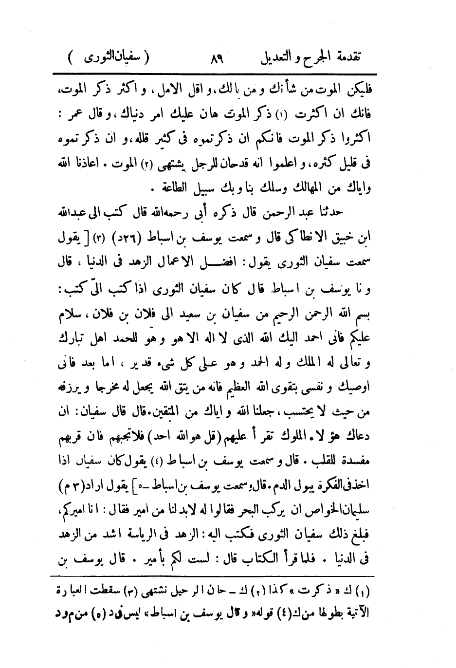 حَدثنا عَبد الرَّحمن، قال: ذكره أبي رحمه الله قال: كتب إلي عَبد الله بن خبيق الأنطاكي قال: وسمعت يوسف بن أسباط يقول: سَمِعتُ سُفيان الثَّوري يقول: أفضل الأعمال الزهد في الدنيا، قال: وحَدثنا يوسف بن أسباط قال: كان سُفيان الثَّوري إِذا كتب إلي كتب: بسم الله الرَّحمن الرحيم، من سُفيان بن سَعيد إلى فلان بن فلان، سلام عليكم، فإِني أَحمد إليك الله الذي لا إله إِلاَّ هو وَهو للحمد أهل تبارك وتعالى له الملك وله الحمد، وهو على كل شيء قدير؛ أما بعد فإِني أوصيك ونفسي بتقوى الله العظيم، فإِنه من يتق الله يجعل له مخرجا ويرزقه من حيث لا يحتسب، جعلنا الله وإياك من المتقين، قال: قال سُفيان: إِن دعاك هؤلاء الملوك تقرأ عليهم: {قل هو الله أحد} فلا تجبهم فإِن قربهم مفسدة للقلب، قال: وسمعت يوسف بن أسباط يقول: كان سُفيان إِذا أخذ في الفكرة يبول الدم، قال: وسمعت يوسف بن أسباط يقول: أراد سليمان الخواص أَن يركب البحر فقالوا له: لابد لنا من أمير، فقال: أَنَا أميركم، فبلغ ذلك سُفيان الثَّوري، فكتب إِليه: الزهد في الرياسة أشد من الزهد في الدنيا، فلما قرأ الكتاب قال: لست لكم بأمير، قال يوسف بن أسباط: قال لي سُفيان الثَّوريّ: لأَن أخلف عشرة آلاف درهم يحاسبني الله عز وجل عليها، أَحَب إِلَيَّ من أَن أحتاج إلى الناس.