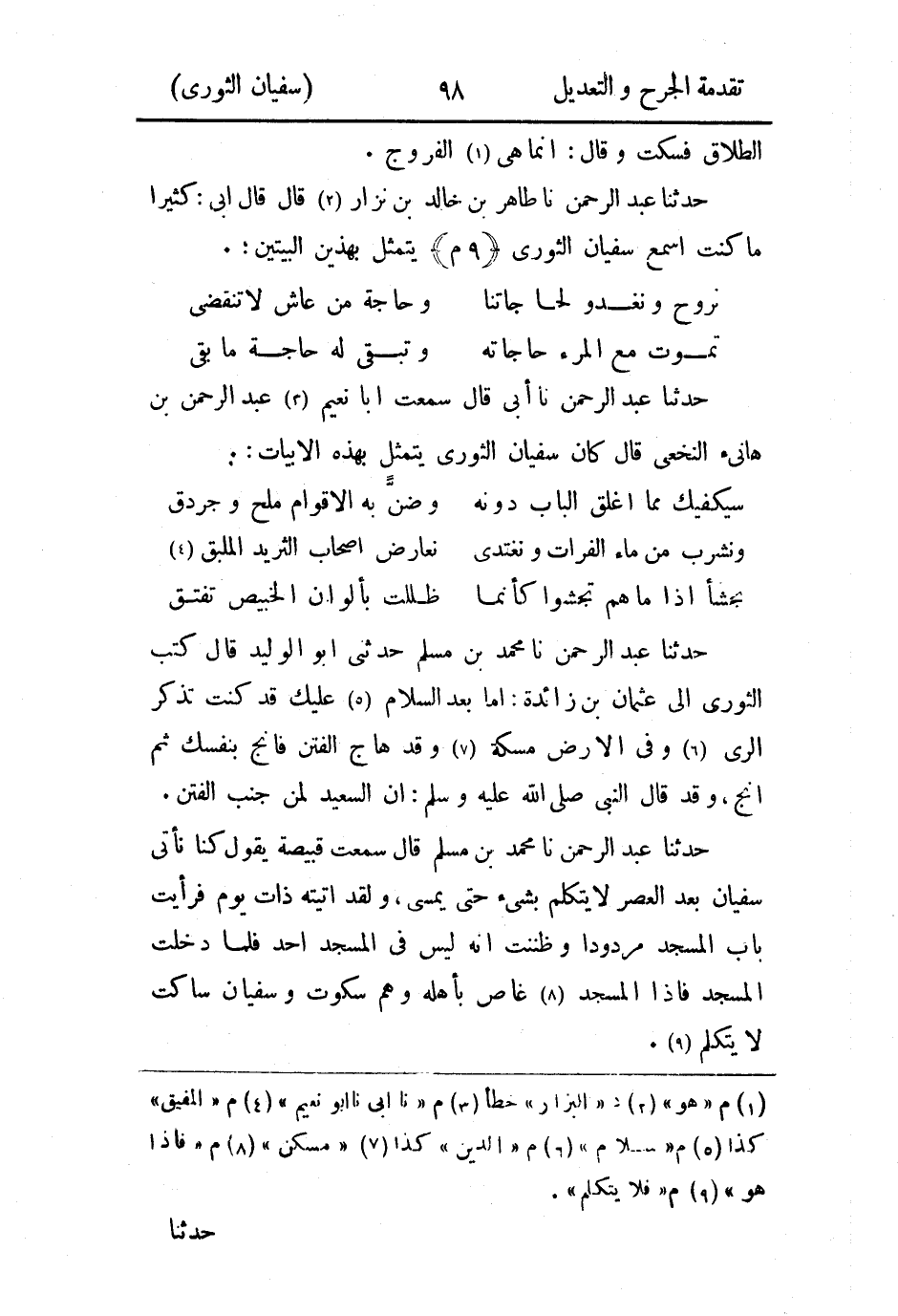 حَدثنا عَبد الرَّحمن، حَدثنا أَبي، قال: سَمِعتُ أبَا نُعَيم عَبد الرَّحمن بن هانئ النخعي قال كان سُفيان الثَّوري يتمثل بهذه الأبيات :