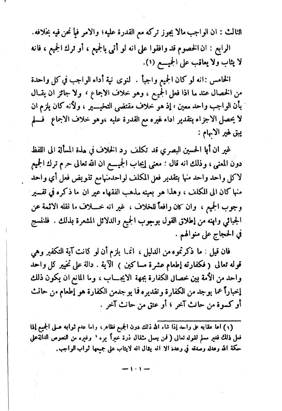 الرَّابِعُ: أَنَّ الْخُصُومَ قَدْ وَافَقُوا عَلَى أَنَّهُ لَوْ أَتَى بِالْجَمِيعِ أَوْ تَرَكَ الْجَمِيعَ فَإِنَّهُ لَا يُثَابُ وَلَا يُعَاقَبُ عَلَى الْجَمِيعِ. (١) الْخَامِسُ: أَنَّهُ لَوْ كَانَ الْجَمِيعُ وَاجِبًا لَنَوَى نِيَّةَ أَدَاءِ الْوَاجِبِ فِي كُلِّ وَاحِدَةٍ مِنَ الْخِصَالِ عِنْدَ مَا إِذَا فَعَلَ الْجَمِيعَ، وَهُوَ خِلَافُ الْإِجْمَاعِ، وَلَا جَائِزٌ أَنْ يُقَالَ بِأَنَّ الْوَاجِبَ وَاحِدٌ مُعَيَّنٌ إِذْ هُوَ خِلَافُ مُقْتَضَى التَّخْيِيرِ، وَلِأَنَّهُ كَانَ يَلْزَمُ أَنْ لَا يَحْصُلَ الْإِجْزَاءُ بِتَقْدِيرِ أَدَاءِ غَيْرِهِ مَعَ الْقُدْرَةِ عَلَيْهِ، وَهُوَ خِلَافُ الْإِجْمَاعِ فَلَمْ يَبْقَ غَيْرُ الْإِبْهَامِ.