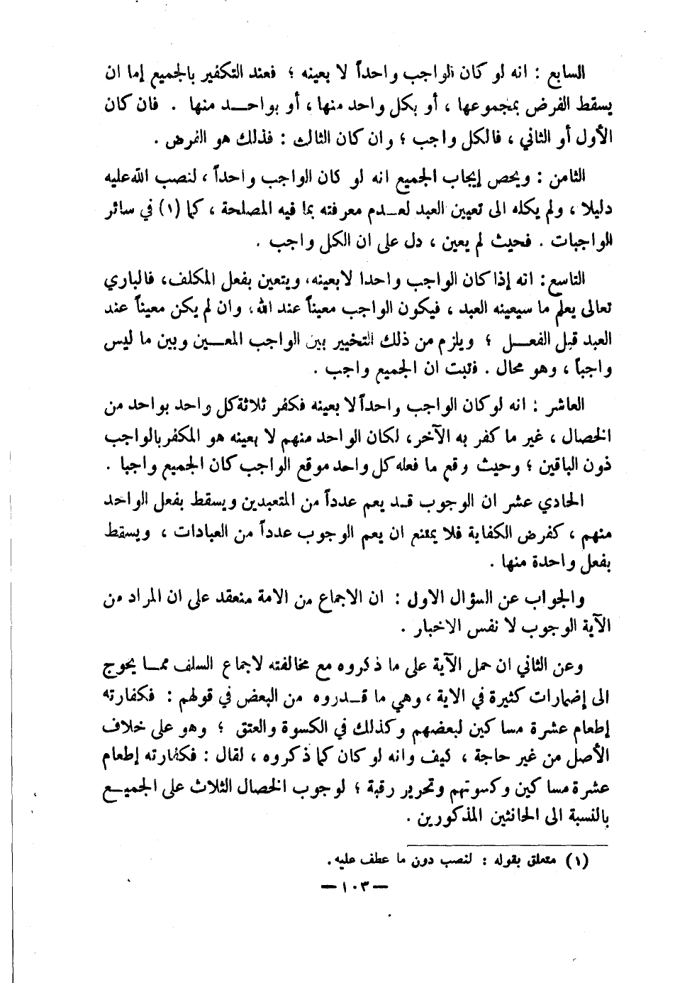 السَّابِعُ: أَنَّهُ لَوْ كَانَ الْوَاجِبُ وَاحِدًا لَا بِعَيْنِهِ، فَعِنْدَ التَّكْفِيرِ بِالْجَمِيعِ إِمَّا أَنْ يَسْقُطَ الْفَرْضُ بِمَجْمُوعِهَا، أَوْ بِكُلِّ وَاحِدٍ مِنْهَا، أَوْ بِوَاحِدٍ مِنْهَا، فَإِنْ كَانَ الْأَوَّلَ أَوِ الثَّانِيَ فَالْكُلُّ وَاجِبٌ، وَإِنْ كَانَ الثَّالِثَ فَذَلِكَ هُوَ الْفَرْضُ.