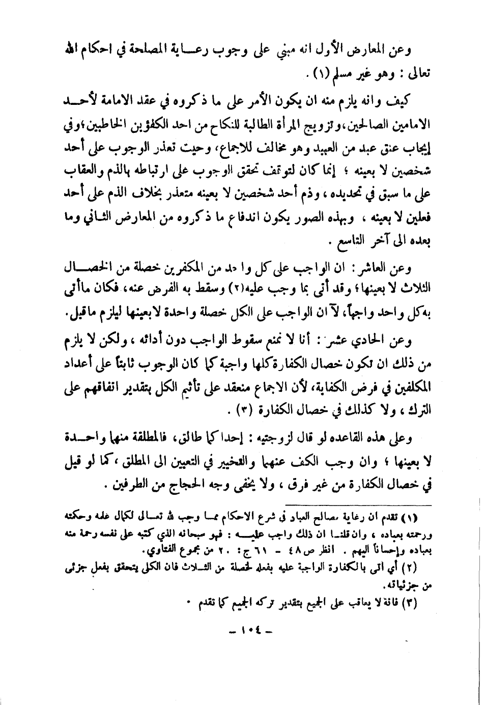 وَعَنِ الْمُعَارِضِ الْأَوَّلِ أَنَّهُ مَبْنِيٌّ عَلَى وُجُوبِ رِعَايَةِ الْمَصْلَحَةِ فِي أَحْكَامِ اللَّهِ تَعَالَى، وَهُوَ غَيْرُ مُسَلَّمٍ. (١) كَيْفَ وَأَنَّهُ يَلْزَمُ مِنْهُ أَنْ يَكُونَ الْأَمْرُ عَلَى مَا ذَكَرُوهُ فِي عَقْدِ الْإِمَامَةِ لِأَحَدِ الْإِمَامَيْنِ الصَّالِحَيْنِ، وَتَزْوِيجِ الْمَرْأَةِ الطَّالِبَةِ لِلنِّكَاحِ مِنْ أَحَدِ الْكُفُؤَيْنِ الْخَاطِبَيْنِ، وَفِي إِيجَابِ عِتْقِ عَبْدٍ مِنَ الْعَبِيدِ وَهُوَ مُخَالِفٌ لِلْإِجْمَاعِ، وَحَيْثُ تَعَذَّرَ الْوُجُوبُ عَلَى أَحَدِ شَخْصَيْنِ لَا بِعَيْنِهِ، إِنَّمَا كَانَ لِتَوَقُّفِ تَحَقُّقِ الْوُجُوبِ عَلَى ارْتِبَاطِهِ بِالذَّمِّ وَالْعِقَابِ عَلَى مَا سَبَقَ فِي تَحْدِيدِهِ، وَذَمُّ أَحَدِ شَخْصَيْنِ لَا بِعَيْنِهِ مُتَعَذِّرٌ بِخِلَافِ الذَّمِّ عَلَى أَحَدِ فِعْلَيْنِ لَا بِعَيْنِهِ، وَبِهَذِهِ الصُّوَرِ يَكُونُ انْدِفَاعُ مَا ذَكَرُوهُ مِنَ الْمُعَارِضِ الثَّانِي وَمَا بَعْدَهُ إِلَى آخِرِ التَّاسِعِ.