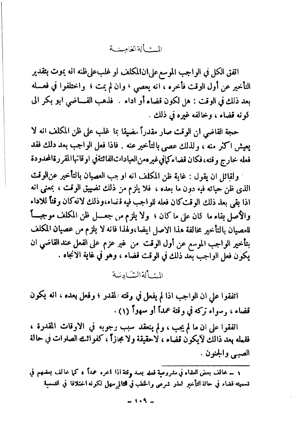(١) خَالَفَ بَعْضُ الْعُلَمَاءِ فِي مَشْرُوعِيَّةِ فِعْلِهِ بَعْدَ وَقْتِهِ إِذَا أَخَّرَهُ عَمْدًا، كَمَا خَالَفَ بَعْضُهُمْ فِي تَسْمِيَتِهِ قَضَاءً فِي حَالَةِ التَّأْخِيرِ لِعُذْرٍ شَرْعِيٍّ، وَالْخَطْبُ فِي الثَّانِي سَهْلٌ ; لِكَوْنِهِ اخْتِلَافًا فِي التَّسْمِيَةِ.