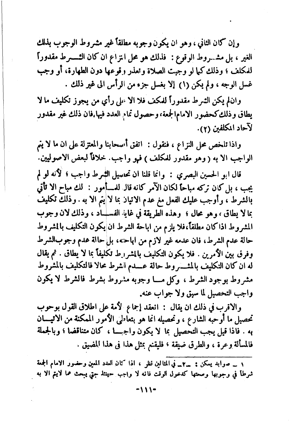 وَإِنْ لَمْ يَكُنِ الشَّرْطُ مَقْدُورًا لِلْمُكَلَّفِ فَلَا، إِلَّا عَلَى رَأْيِ مَنْ يُجَوِّزُ تَكْلِيفَ مَا لَا يُطَاقُ، وَذَلِكَ كَحُضُورِ الْإِمَامِ الْجُمُعَةِ وَحُصُولِ تَمَامِ الْعَدَدِ فِيهَا، فَإِنَّ ذَلِكَ غَيْرُ مَقْدُورٍ لِآحَادِ الْمُكَلَّفِينَ. (٢) وَإِذَا تَلَخَّصَ مَحَلُّ النِّزَاعِ، فَنَقُولُ: اتَّفَقَ أَصْحَابُنَا وَالْمُعْتَزِلَةُ عَلَى أَنَّ مَا لَا يَتِمُّ الْوَاجِبُ إِلَّا بِهِ (وَهُوَ مَقْدُورٌ لِلْمُكَلَّفِ) فَهُوَ وَاجِب، خِلَافًا لِبَعْضِ الْأُصُولِيِّينَ.
