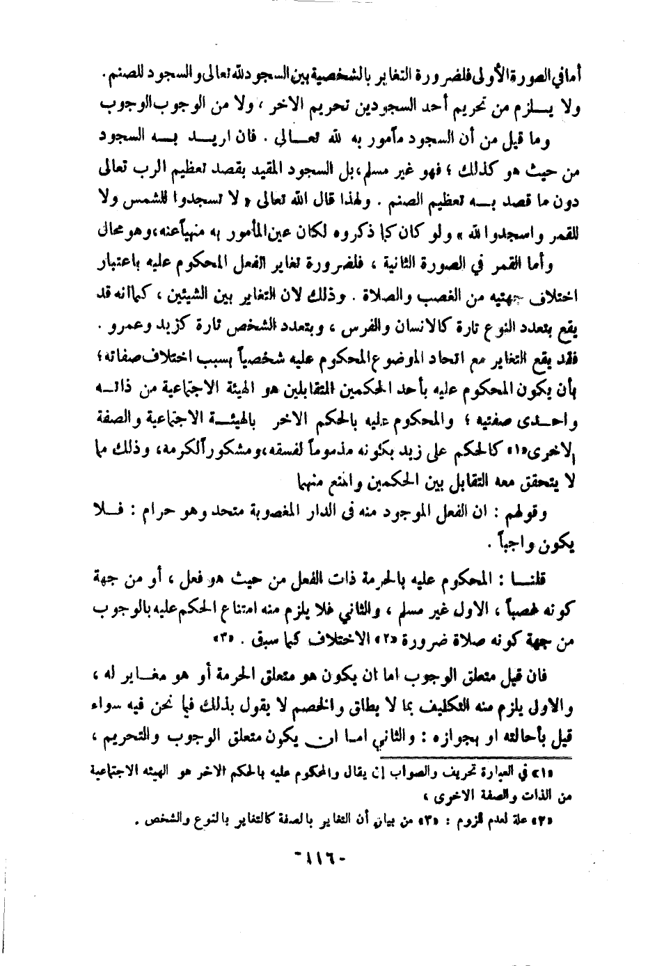 وَأَمَّا الْقَمَرُ فِي الصُّورَةِ الثَّانِيَةِ، فَلِضَرُورَةِ تَغَايُرِ الْفِعْلِ الْمَحْكُومِ عَلَيْهِ بِاعْتِبَارِ اخْتِلَافِ جِهَتَيْهِ مِنَ الْغَصْبِ وَالصَّلَاةِ ; وَذَلِكَ لِأَنَّ التَّغَايُرَ بَيْنَ الشَّيْئَيْنِ كَمَا أَنَّهُ قَدْ يَقَعُ بِتَعَدُّدِ النَّوْعِ تَارَةً كَالْإِنْسَانِ وَالْفَرَسِ، وَبِتَعَدُّدِ الشَّخْصِ تَارَةً كَزَيْدٍ وَعَمْرٍو. فَقَدْ يَقَعُ التَّغَايُرُ مَعَ اتِّحَادِ الْمَوْضُوعِ الْمَحْكُومِ عَلَيْهِ شَخْصِيًّا بِسَبَبِ اخْتِلَافِ صِفَاتِهِ، بِأَنْ يَكُونَ الْمَحْكُومُ عَلَيْهِ بِأَحَدِ الْحُكْمَيْنِ الْمُتَقَابِلَيْنِ هُوَ الْهَيْئَةُ الِاجْتِمَاعِيَّةُ مِنْ ذَاتِهِ وَإِحْدَى صِفَتَيْهِ، وَالْمَحْكُومُ عَلَيْهِ بِالْحُكْمِ الْآخَرِ بِالْهَيْئَةِ الِاجْتِمَاعِيَّةِ وَالصِّفَةِ الْأُخْرَى (١) كَالْحُكْمِ عَلَى زَيْدٍ بِكَوْنِهِ مَذْمُومًا لِفِسْقِهِ وَمَشْكُورًا لِكَرَمِهِ، وَذَلِكَ مِمَّا لَا يَتَحَقَّقُ مَعَهُ التَّقَابُلُ بَيْنَ الْحُكْمَيْنِ وَالْمَنْعِ مِنْهُمَا.