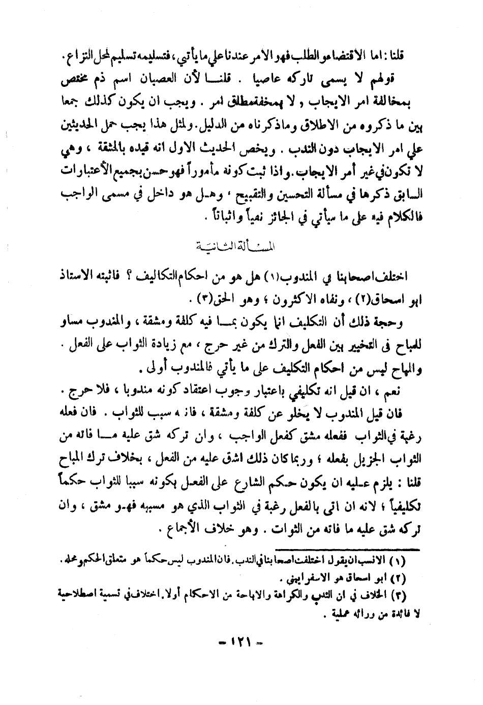 (١) الْأَنْسَبُ أَنْ يَقُولَ: اخْتَلَفَ أَصْحَابُنَا فِي النَّدْبِ، فَإِنَّ الْمَنْدُوبَ لَيْسَ حُكْمًا، هُوَ مُتَعَلِّقُ الْحُكْمِ وَمَحَلُّهُ.