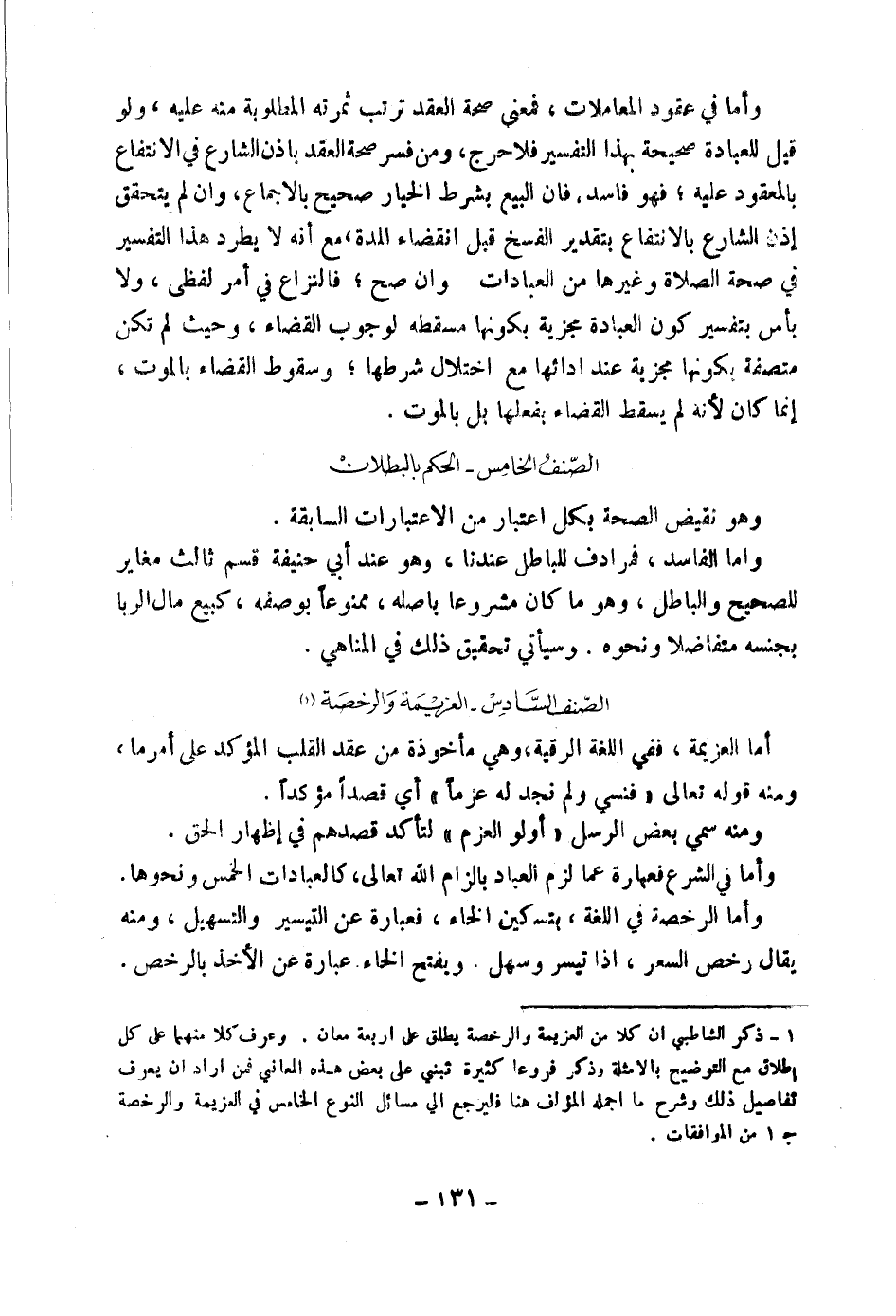 (١) ذَكَرَ الشَّاطِبِيُّ أَنَّ كُلًّا مِنَ الْعَزِيمَةِ وَالرُّخْصَةِ يُطْلَقُ عَلَى أَرْبَعَةِ مَعَانٍ، وَعَرَّفَ كُلًّا مِنْهُمَا عَلَى كُلِّ إِطْلَاقٍ مَعَ التَّوْضِيحِ بِالْأَمْثِلَةِ، وَذَكَرَ فُرُوعًا كَثِيرَةً تُبْنَى عَلَى بَعْضِ هَذِهِ الْمَعَانِي، فَمَنْ أَرَادَ أَنْ يَعْرِفَ تَفَاصِيلَ ذَلِكَ وَشَرْحَ مَا أَجْمَلَهُ الْمُؤَلِّفُ هُنَا فَلْيَرْجِعْ إِلَى مَسَائِلِ النَّوْعِ الْخَامِسِ فِي الْعَزِيمَةِ وَالرُّخْصَةِ جـ ١ مِنَ الْمُوَافِقَاتِ.