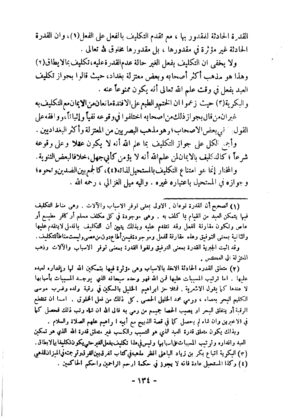 وَبِذَلِكَ يَكُونُ مُتَعَلِّقُ قُدْرَةِ الْعَبْدِ الَّذِي هُوَ التَّسَبُّبُ وَالْكَسْبُ غَيْرَ مُتَعَلِّقِ قُدْرَةِ اللَّهِ الَّذِي هُوَ تَمْكِينُ الْعَبْدِ وَإِقْدَارُهُ وَتَرْتِيبُ الْمُسَبَّبَاتِ عَلَى أَسْبَابِهَا، وَلَيْسَ فِي هَذَا تَكْلِيفٌ بِفِعْلِ الْغَيْرِ، حَتَّى يَكُونَ تَكْلِيفًا بِمَا لَا يُطَاقُ.