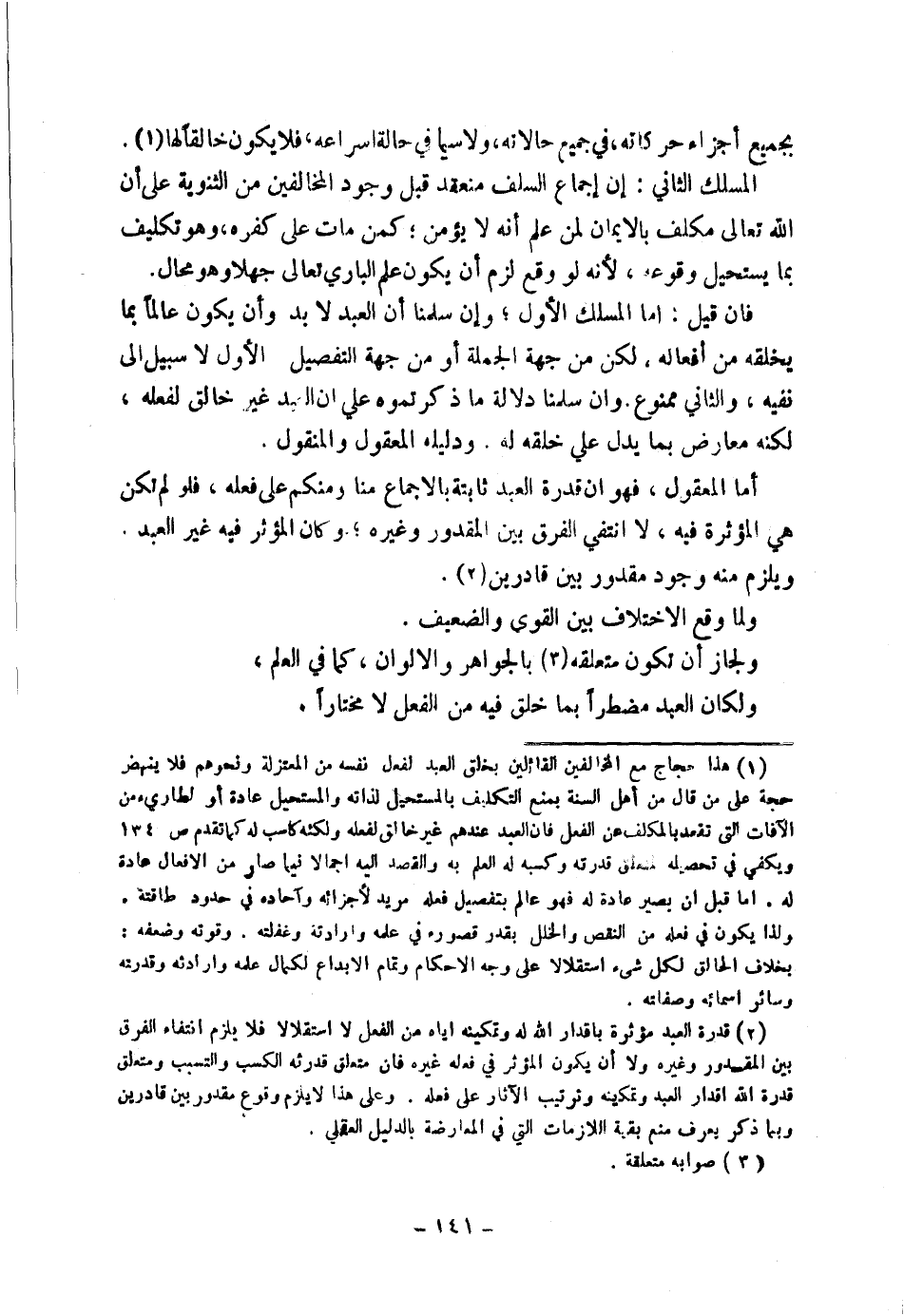 (٢) قُدْرَةُ الْعَبْدِ مُؤَثِّرَةٌ بِإِقْدَارِ اللَّهِ لَهُ، وَتَمْكِينِهِ إِيَّاهُ مِنَ الْفِعْلِ لَا اسْتِقْلَالًا، فَلَا يَلْزَمُ انْتِفَاءُ الْفَرْقِ بَيْنَ الْمَقْدُورِ وَغَيْرِهِ، وَلَا أَنْ يَكُونَ الْمُؤَثِّرُ فِي فِعْلِهِ غَيْرَهُ، فَإِنَّ مُتَعَلِّقَ قُدْرَتِهِ الْكَسْبُ وَالتَّسَبُّبُ، وَمُتَعَلِّقَ قُدْرَةِ اللَّهِ إِقْدَارُ الْعَبْدِ وَتَمْكِينُهُ، وَتَرْتِيبُ الْآثَارِ عَلَى فِعْلِهِ، وَعَلَى هَذَا لَا يَلْزَمُ وُقُوعُ مَقْدُورٍ بَيْنَ قَادِرَيْنِ، وَبِمَا ذُكِرَ يُعْرَفُ مَنْعُ بَقِيَّةِ اللَّازِمَاتِ الَّتِي فِي الْمُعَارَضَةِ بِالدَّلِيلِ الْعَقْلِيِّ.
